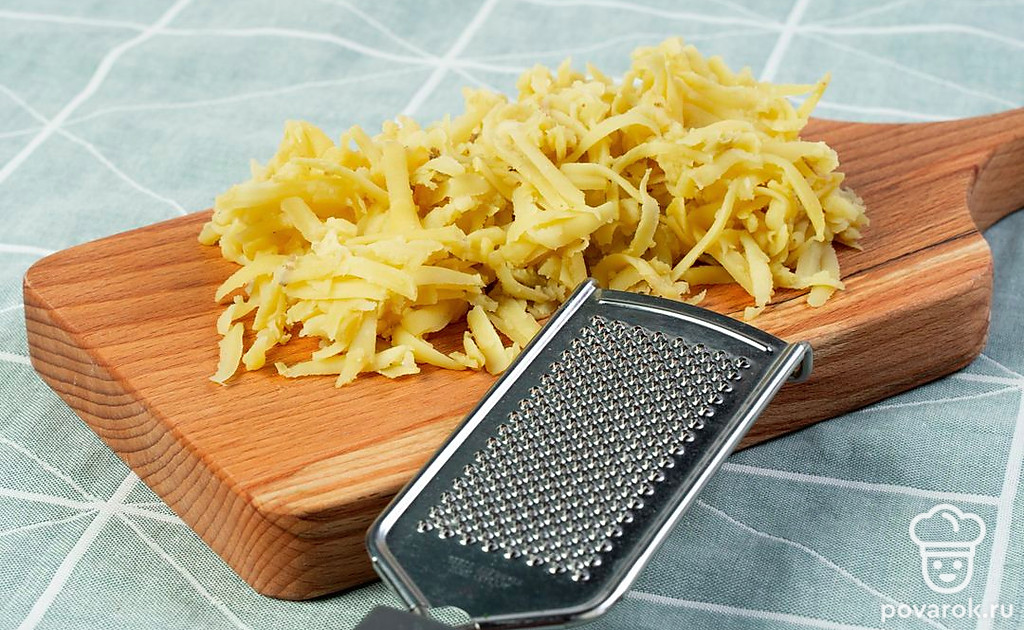 Сварите картофель. В отдельную кастрюлю сложите неочищенные клубни картофеля. Залейте их водой и поставьте на сильный огонь. Доведите воду до кипения и варите, уменьшив огонь, примерно 25-30 минут. После варки клубни остудите, очистите от кожуры и натрите на крупной терке.