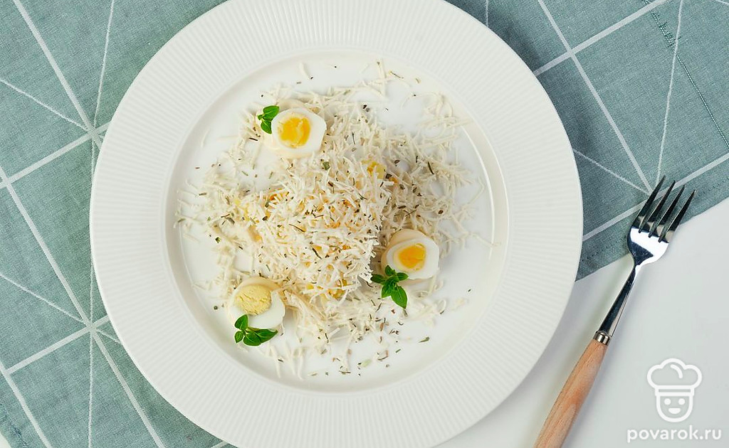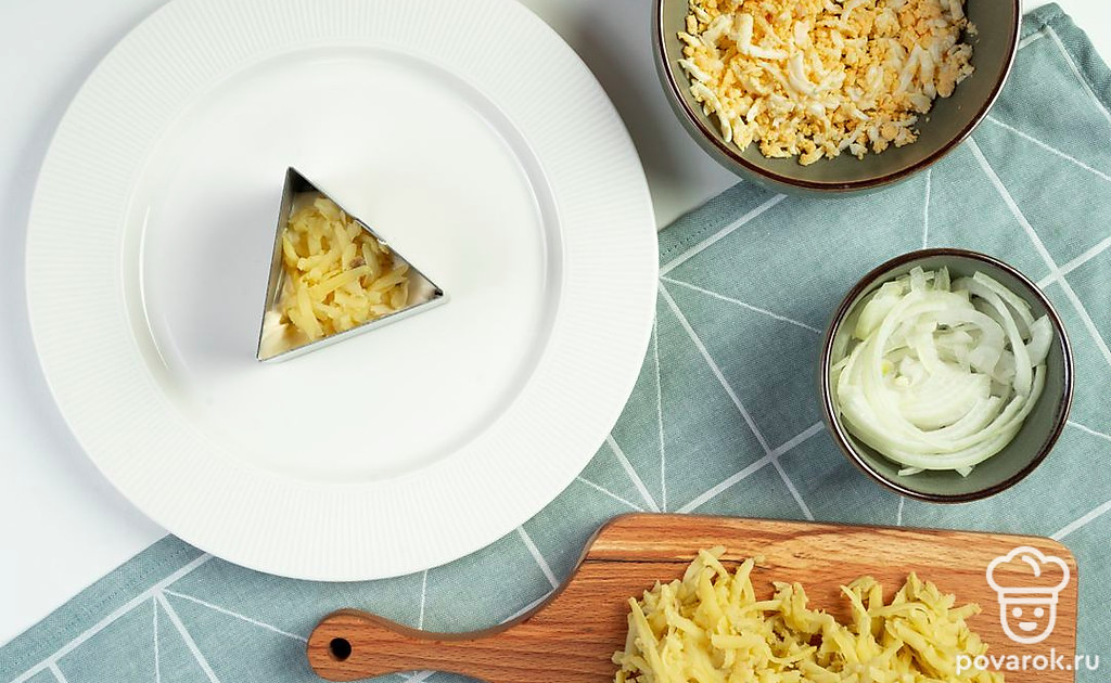 Вскипятите воду. Смешайте соль, сахар, уксус и залейте все кипятком. Лук очистите, порежьте кольцами и замаринуйте в подготовленной смеси. Оставьте мариноваться при комнатной температуре 15 минут. Затем лук выложите на дуршлаг и дайте стечь лишней жидкости. Картофель тщательно промойте. Яйца отварите 8-10 минут в кипящей воде. Остудите, очистите и натрите на мелкой терке или раскрошите вилкой. Сыр положите в морозилку на 20-30 минут, так он легче натирается.