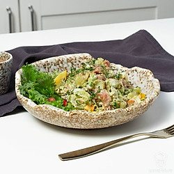 Салат с курицей и зеленой редькой будет эффектно смотреться, если выложить его на листя салата, используя широкое блюдо.