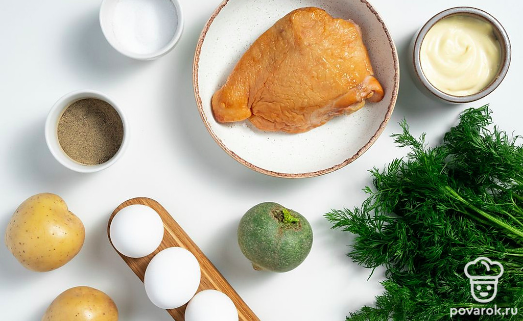 Окорочок очистите от кожи, снимите мясо с костей. Редьку очистите, помойте и обсушите. Яйца сварите вкрутую, остудите и очистите от скорлупы. Картофель сварите в мундире, остудите и почистите. Промойте укроп и петрушку, обсушите, мелко порежьте по отдельности.