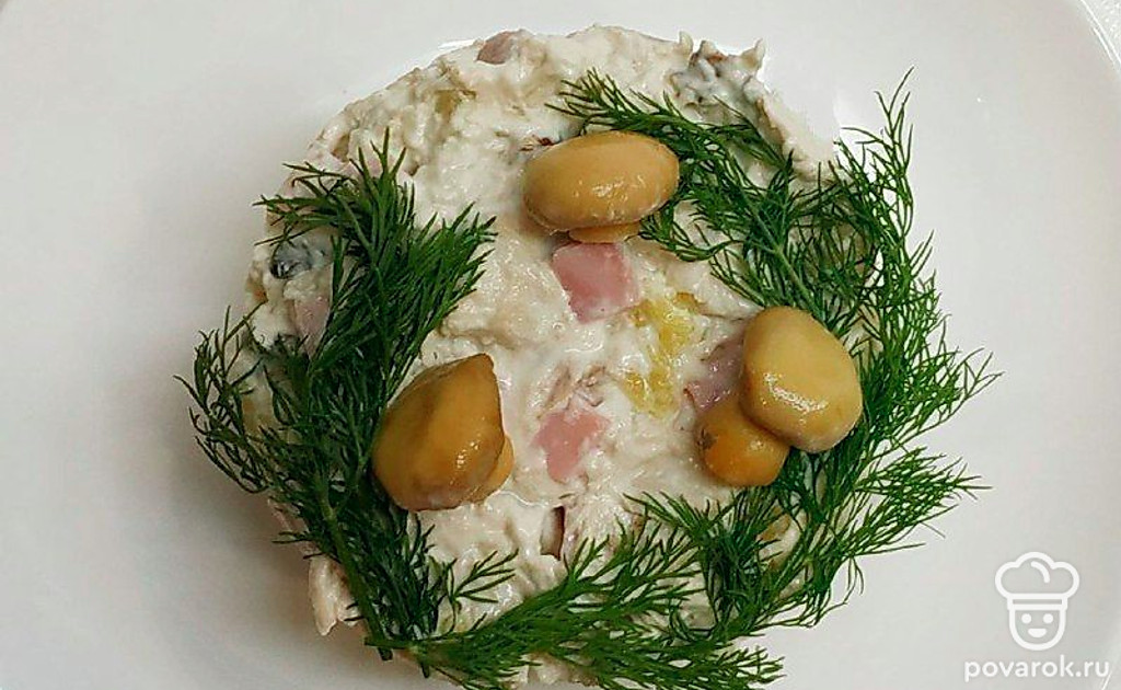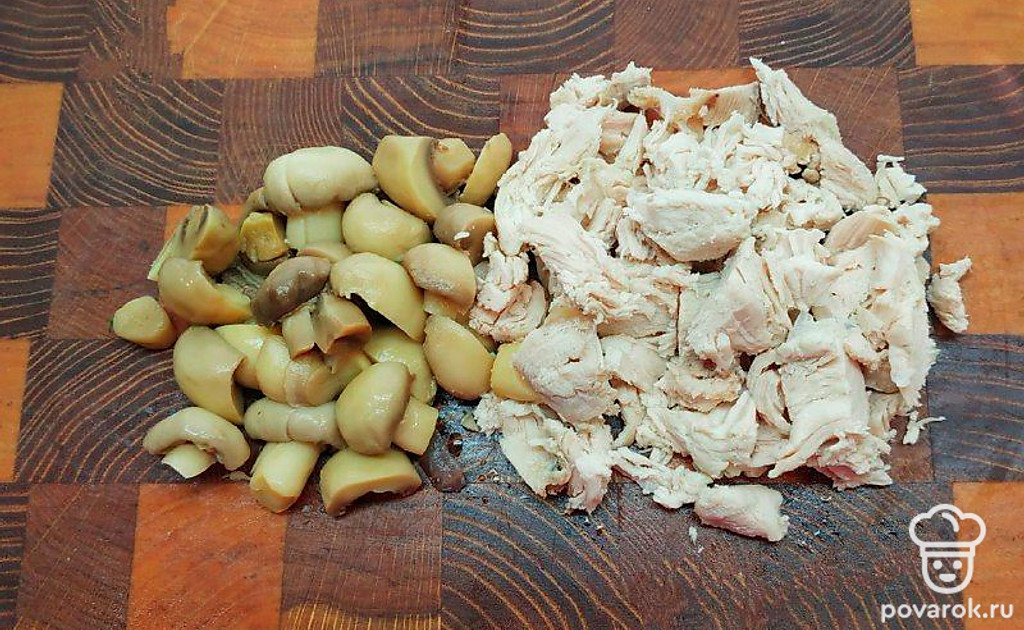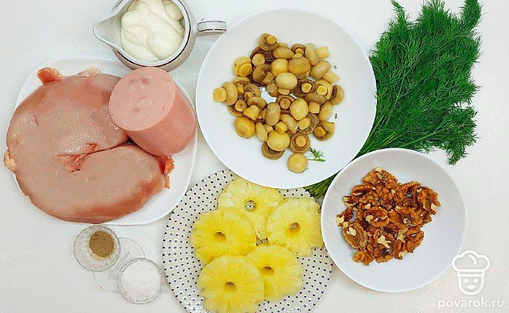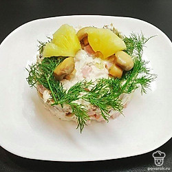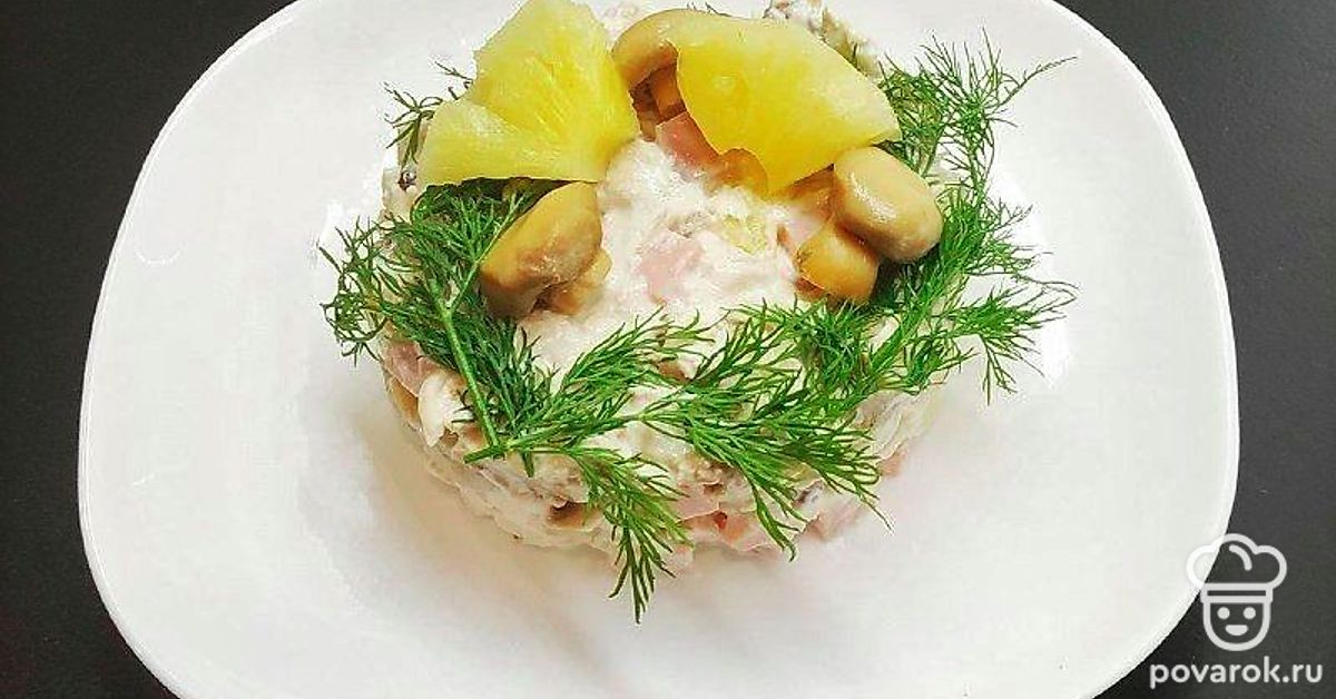 Насыщенный вкусами и ароматами салат получается из курицы, грибов, ананасов и орехов. Интересно, что в нем соединяются продукты, которые сами по себе самодостаточные, но и сочетание их друг с другом только прибавляет плюсы. Блюдо в таком составе открывает новые нотки текстуры, запахов, а общее впечатление только улучшает. Приготовить его можно без труда.
