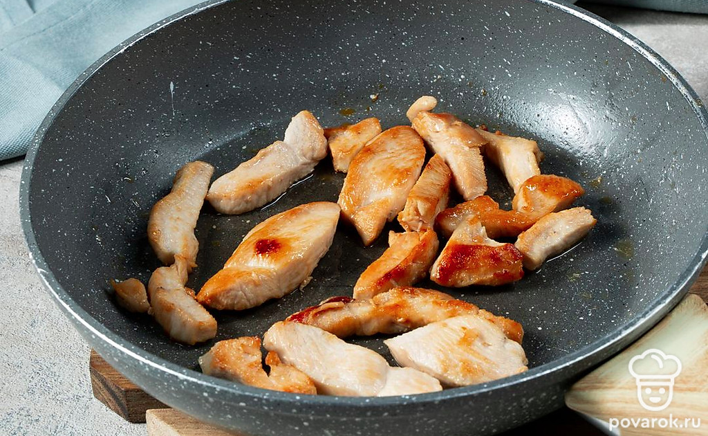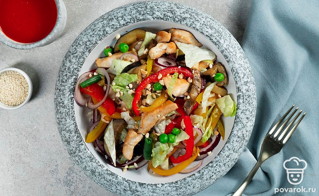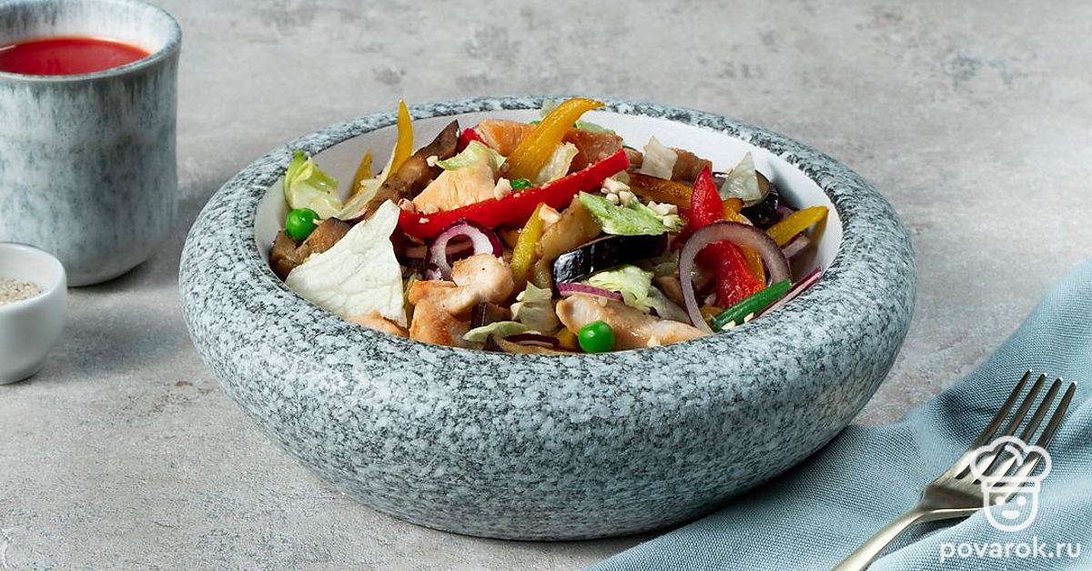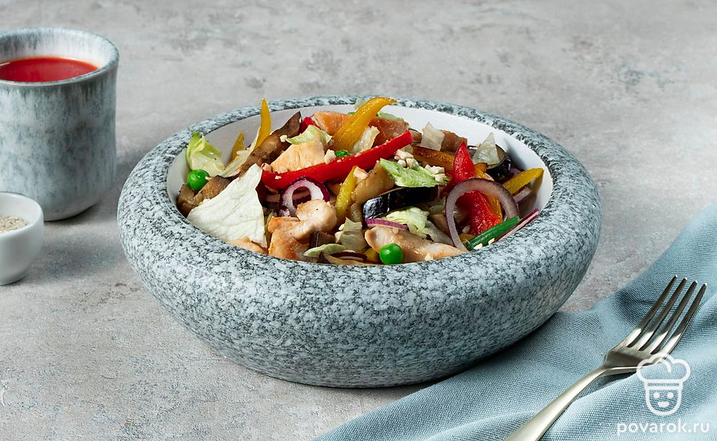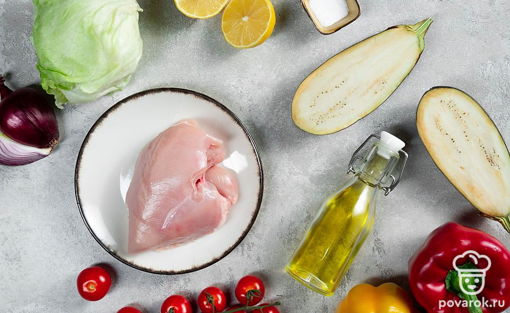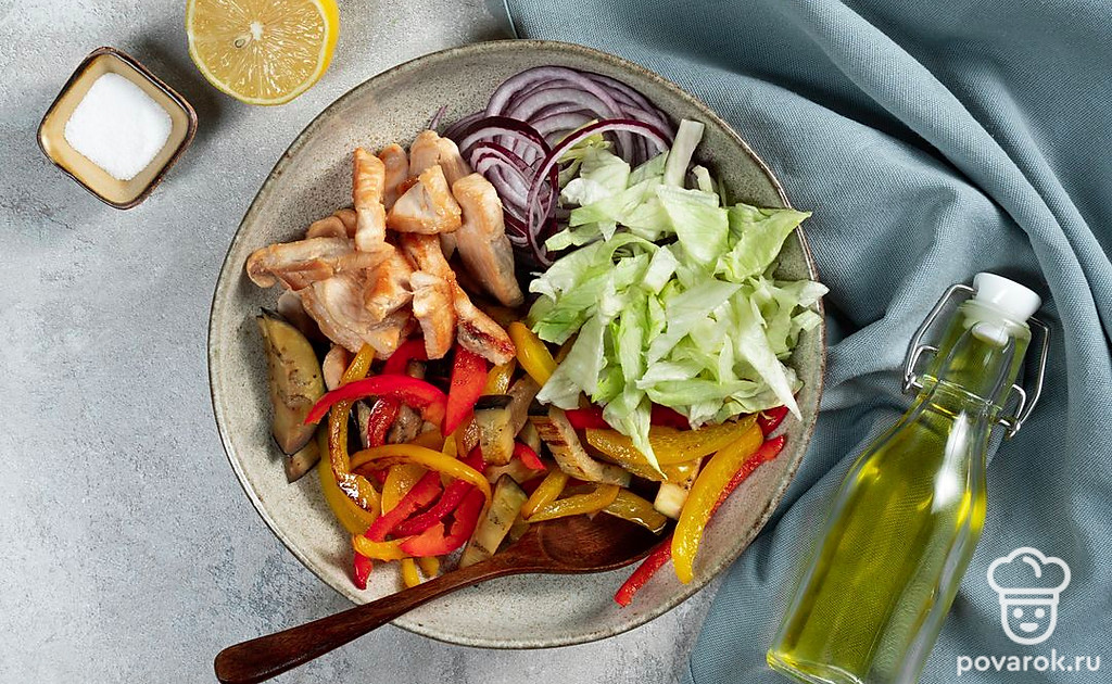 Салат с курицей и оливковым маслом особенно хорош в компании помидоров черри, запеченных баклажанов и болгарского перца. Для свежести вкуса добавьте листья салата и сок лимона. Кольца красного лука сделают этот салат еще наряднее и сочней.
