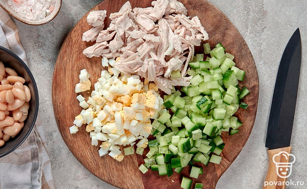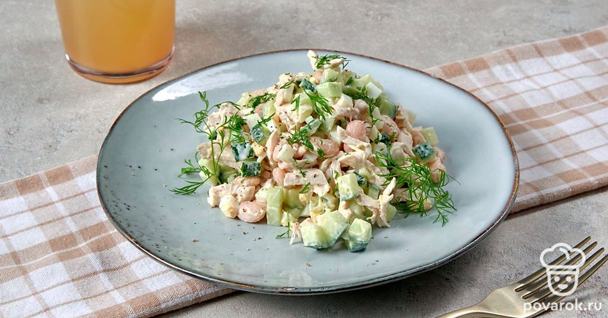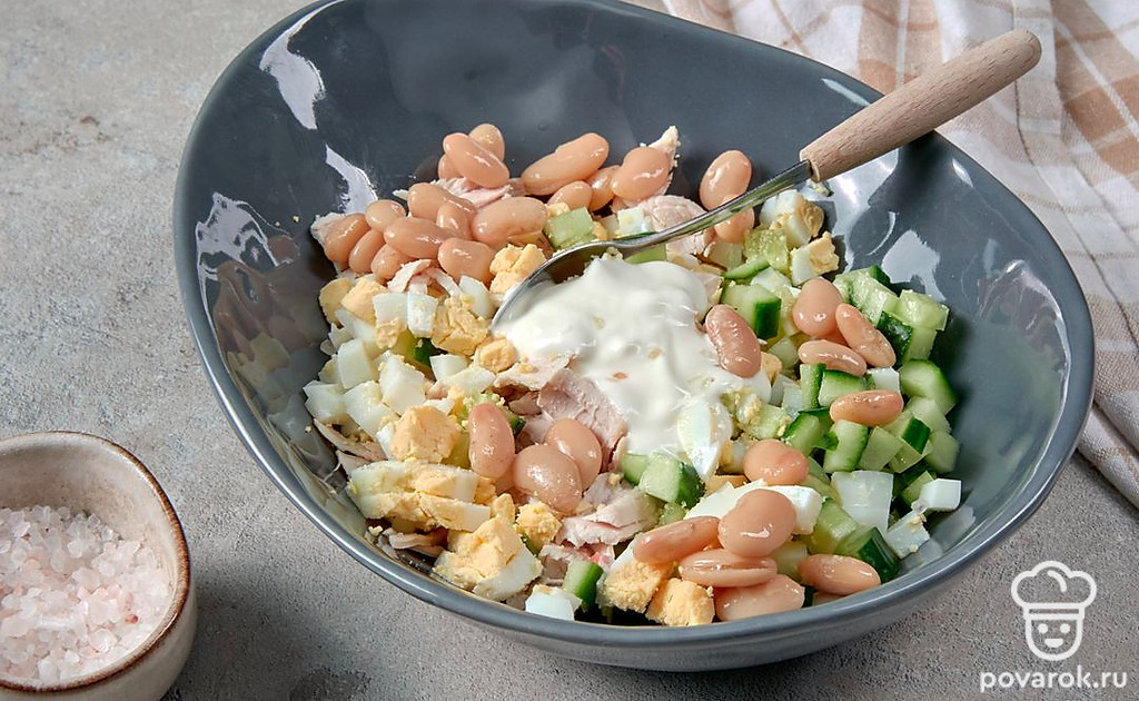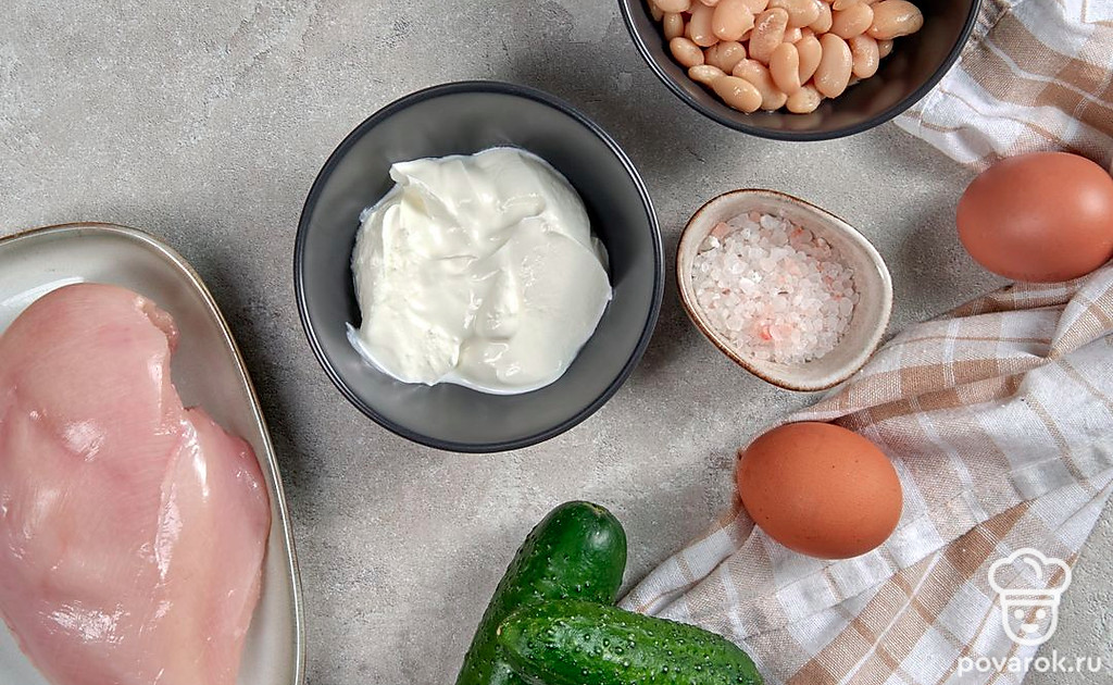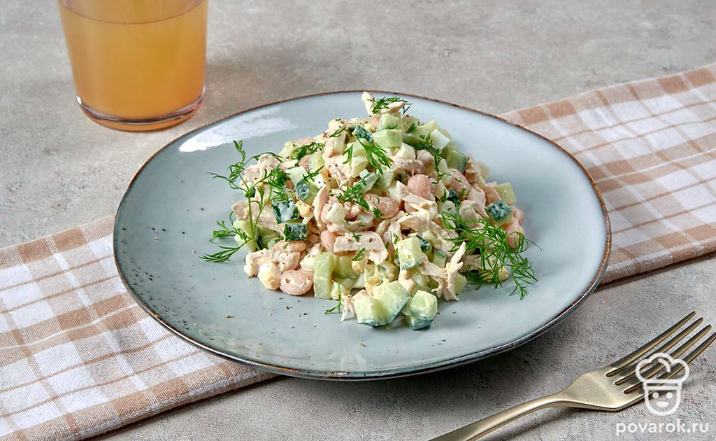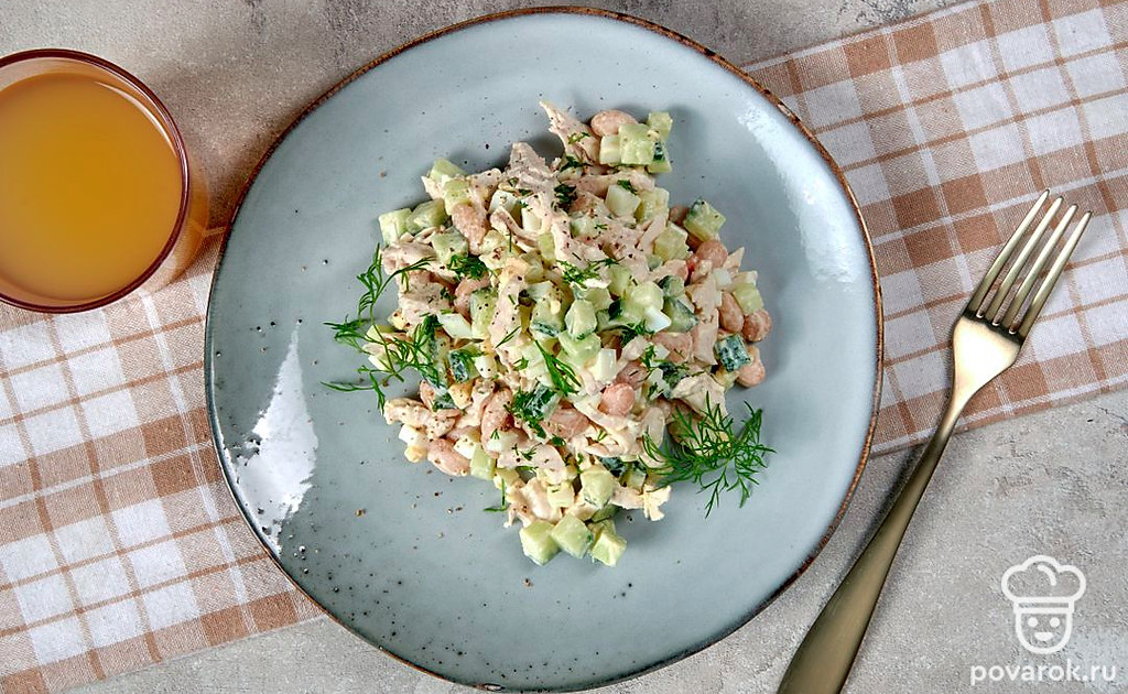 Салаты с курицей — одно из самых популярных ПП блюд. Если хотите стройнеть правильно, то диетические блюда с куриной грудкой – именно то, что необходимо для идеального сочетания пользы и вкуса. При соединении куриного мяса и фасоли салат получится не только полезным, но и очень сытным. Он прекрасно заменит полноценный обед или ужин. Заправлять блюдо нужно греческим или любым другим натуральным йогуртом.