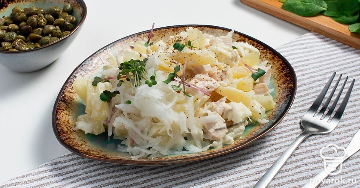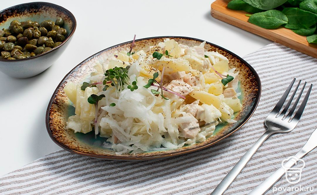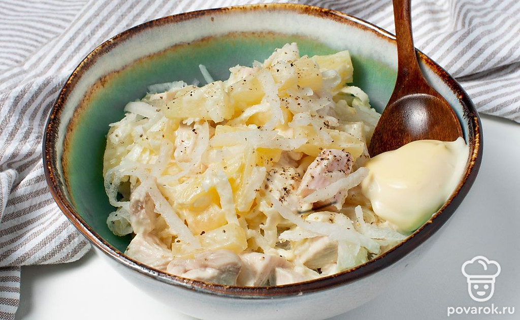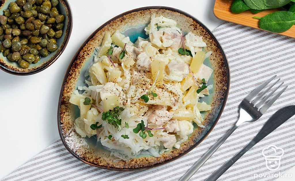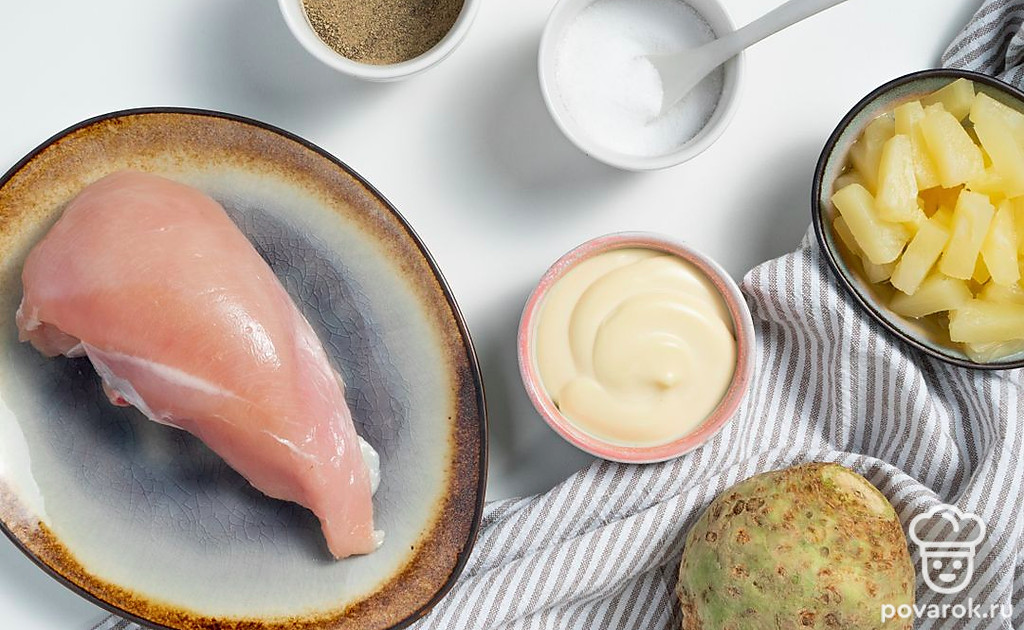 Салат с курицей и корнем сельдерея — вкусное и несложное в исполнении блюдо, прекрасно подходящее для тех, кто придерживается правильного питания. Нежное куриное филе отлично гармонирует с сочным овощем. Дополняет это сочетание ананас, добавляя салату приятное сладковатое послевкусие. При желании блюдо можно сделать полезнее, заменив майонез на нежирную сметану или натуральный йогурт. Благодаря этому салат станет более легким и менее калорийным.