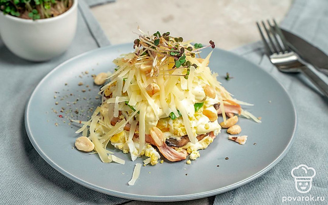Салат «Ежик» с копченой курицей — необычный вариант подачи салата, приготовленного на основе жареных грибов и нежного мяса. В состав курицы входит большое количество ценных для здоровья элементов — например, фосфор, железо и калий. Они являются незаменимыми для человека материалами, помогающими предотвратить инфаркт, инсульт и гипертонию. К тому же, мясо курицы содержит легко усваиваемый белок и при этом совсем немного калорий, что делает его подходящим для диетического питания.