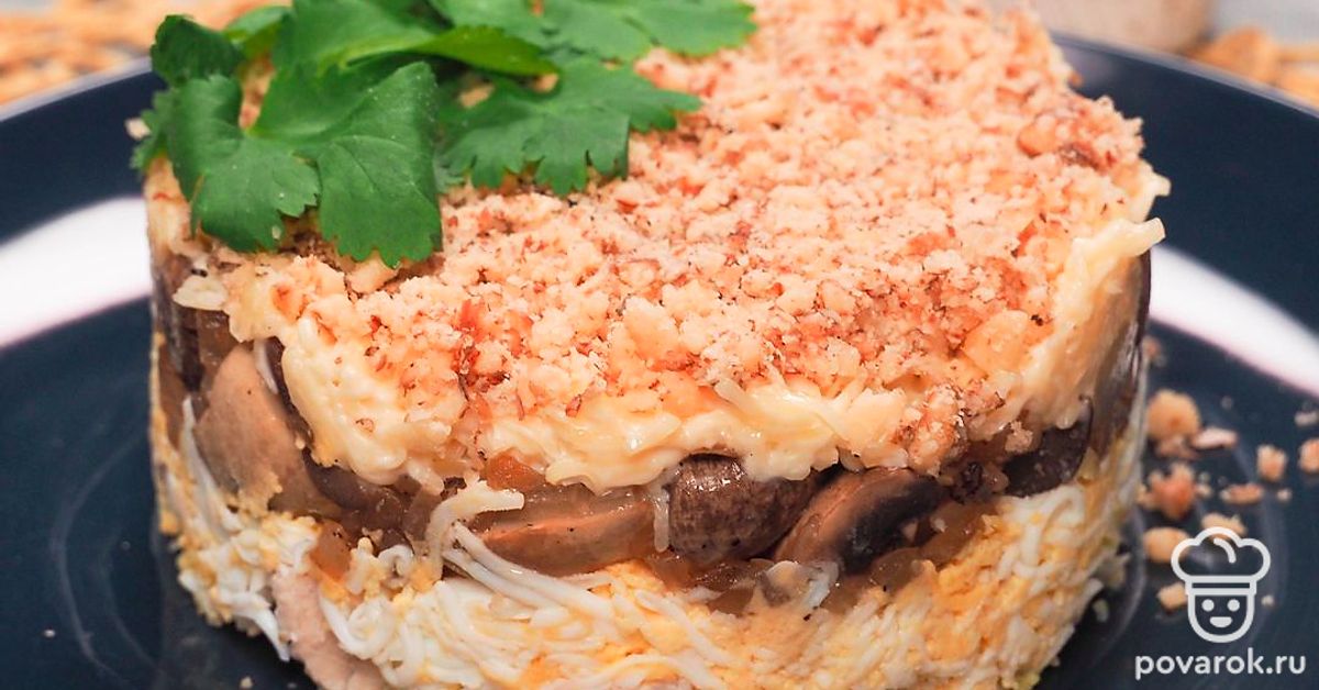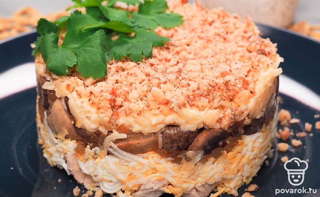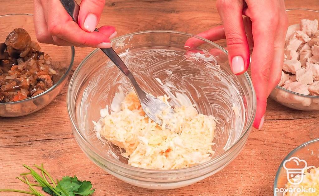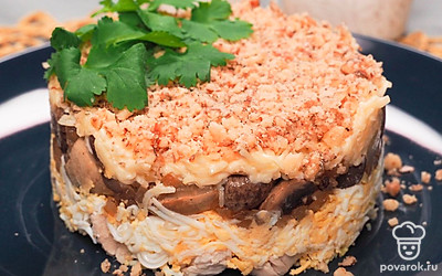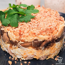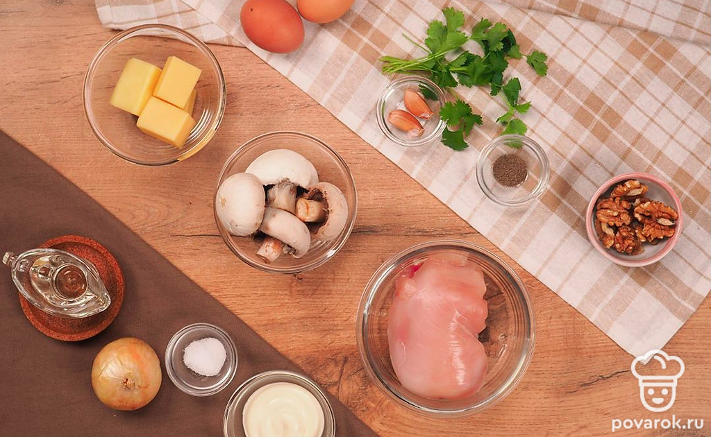 Салат с курицей, жареными грибами и сыром — сытное и вкусное блюдо, которое украсит любой праздничный стол. В его состав входят шампиньоны, куриная грудка, яйцо, лук, твердый сыр, а также грецкие орехи. Ингредиенты готовят отдельно, а затем выкладывают слоями. В качестве заправки вместо майонеза можно использовать обезжиренный йогурт.