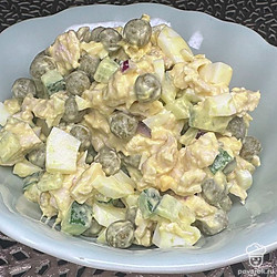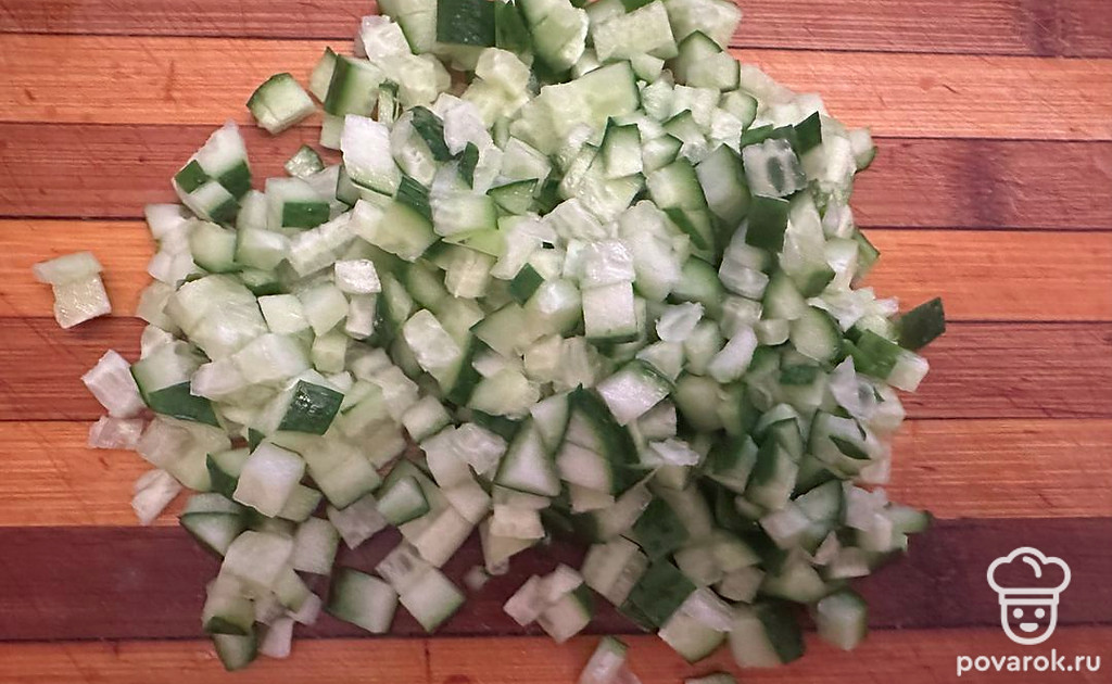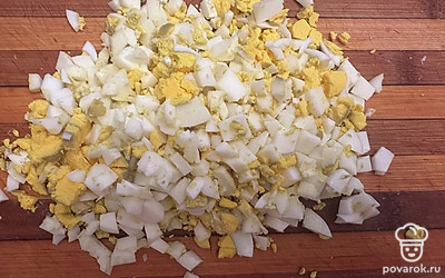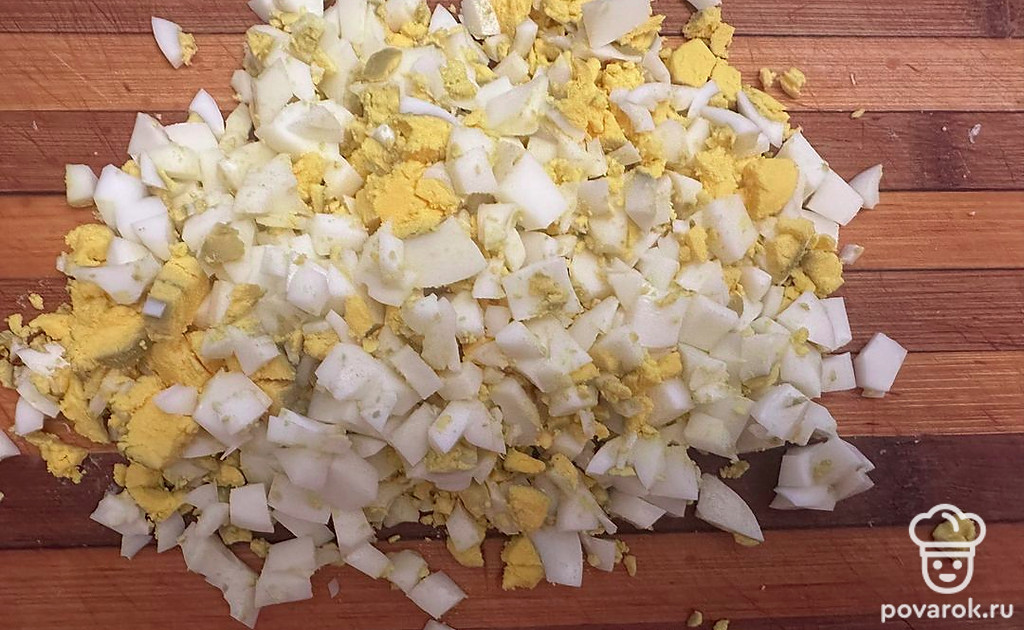 Яйца сварите вкрутую, остудите и почистите. Нарежьте кубиком.