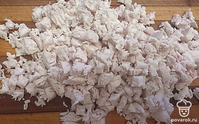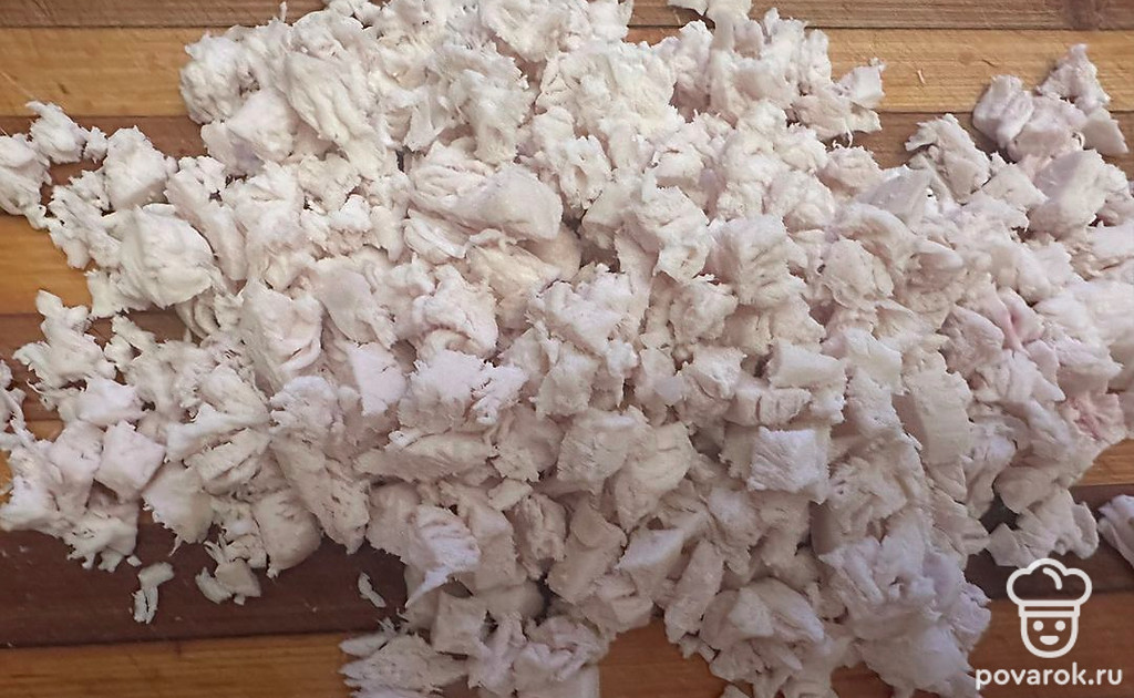 Филе курицы отварите в подсоленной воде до готовности. Остудите. Нарежьте кубиком.