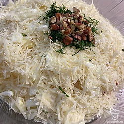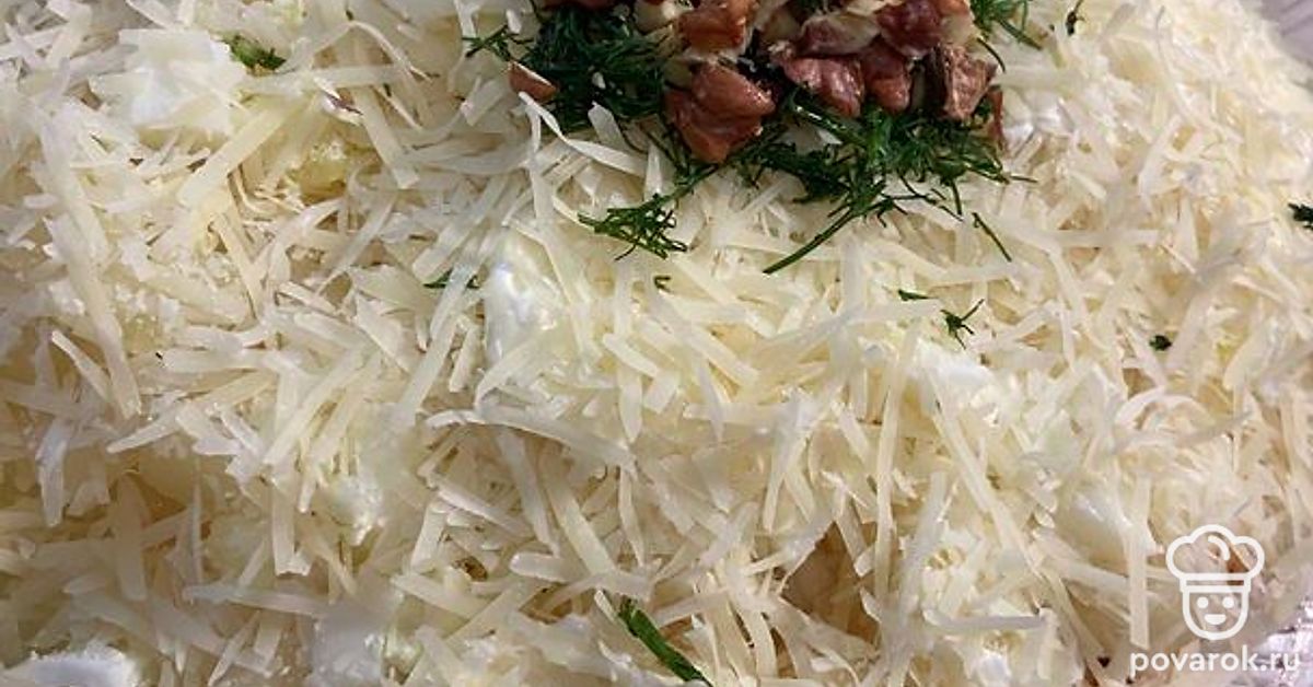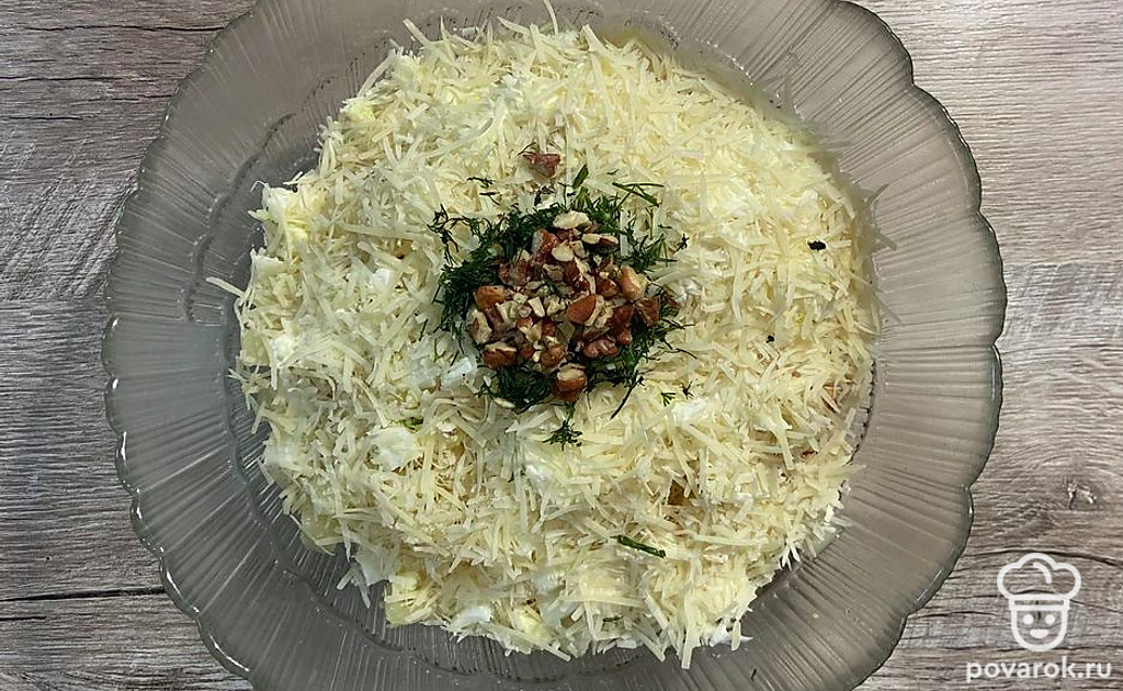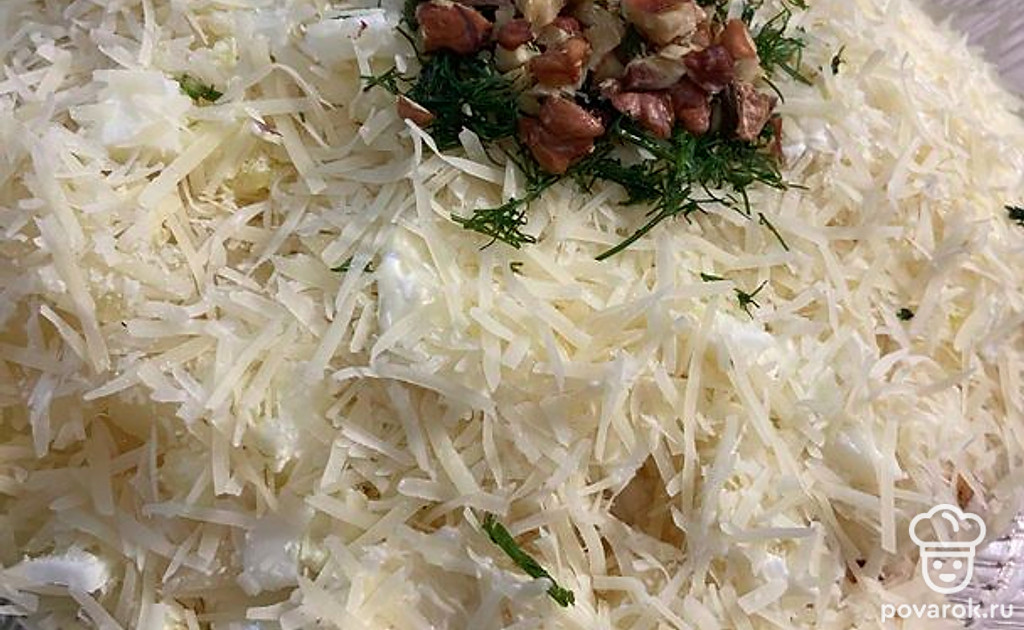 Салат готов! Для красивой подачи используйте свежую зелень и мелко нарезанные грецкие орехи.