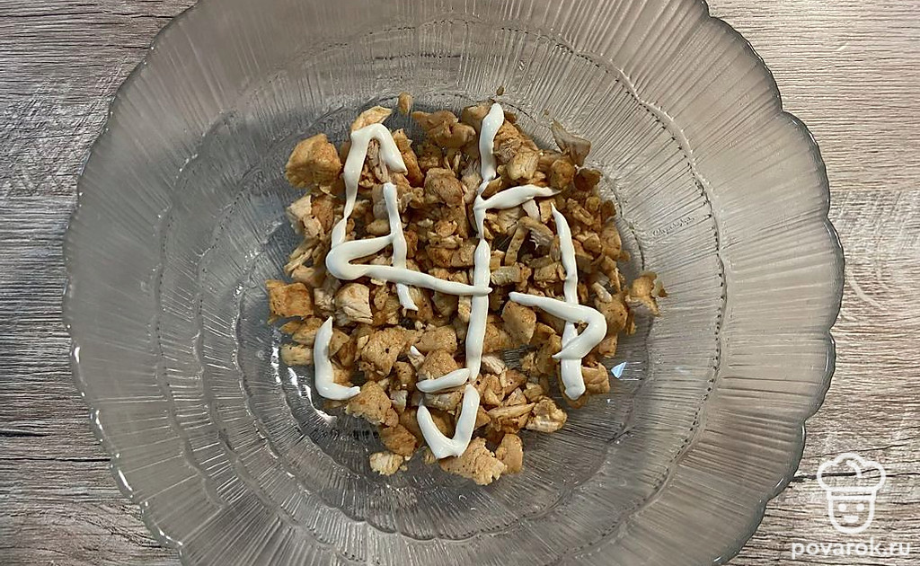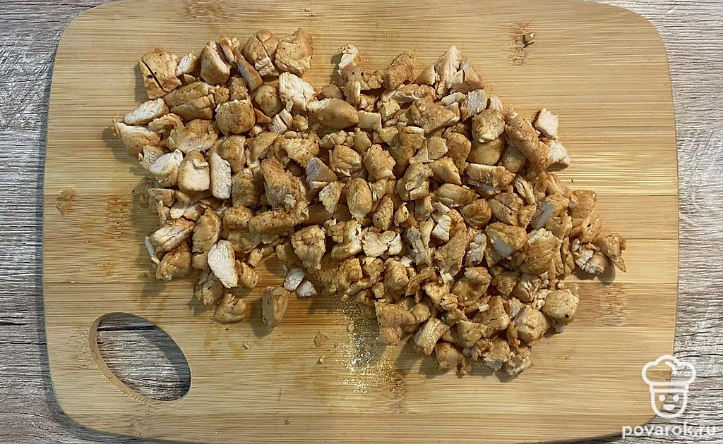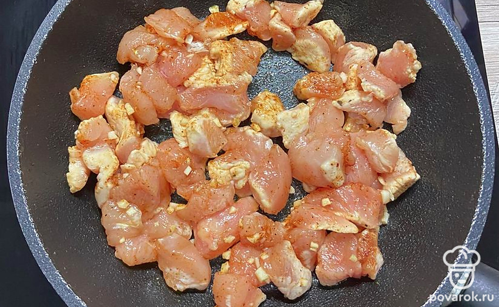 Обжарьте или сварите мясо. Если жарить с чесноком и специями, получается намного вкуснее и сочнее. Мясо предварительно нарежьте на маленькие кусочки.