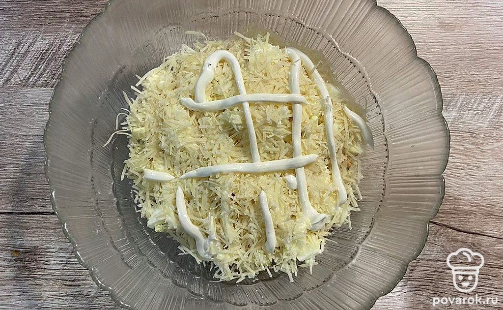 Посыпьте половиной натертого на мелкой терке сыра. Смажьте соусом. А затем повторите все слои, используя оставшуюся половину ингредиентов.