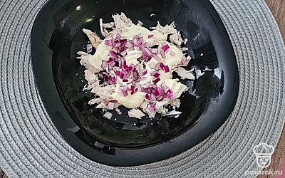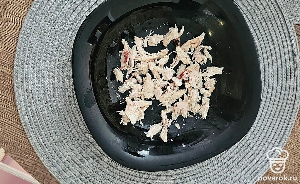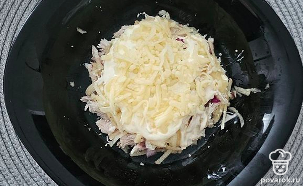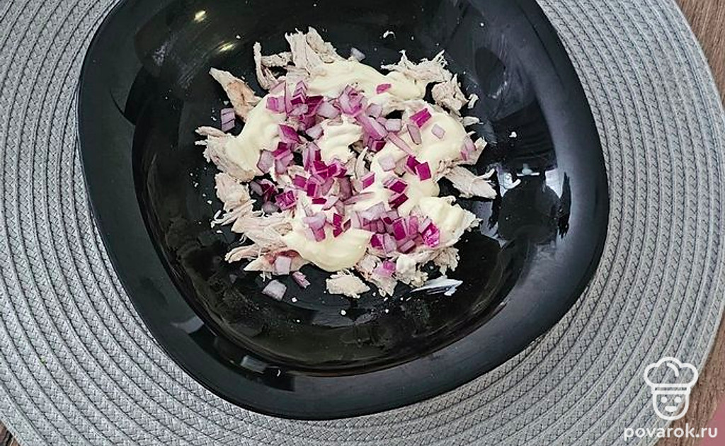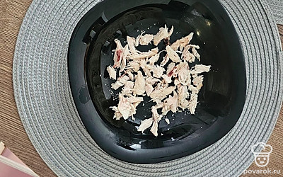 Куриное филе разделите на мелкие волокна. Промажьте майонезом.