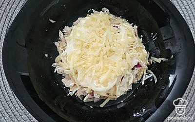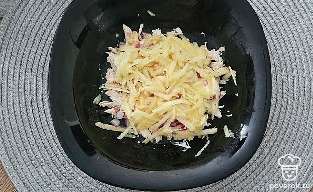 Почистите яблоко, натрите на терке. Выложите яблоко. Смажьте майонезом.