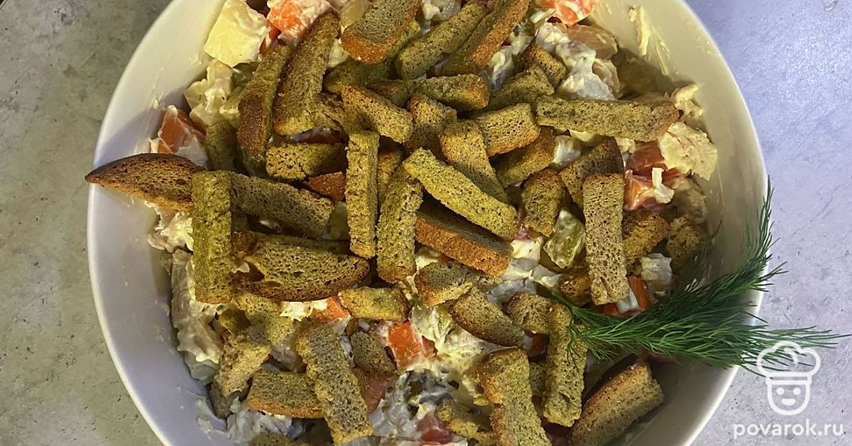 Салат с куриной грудкой, сыром, овощами и сухариками