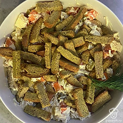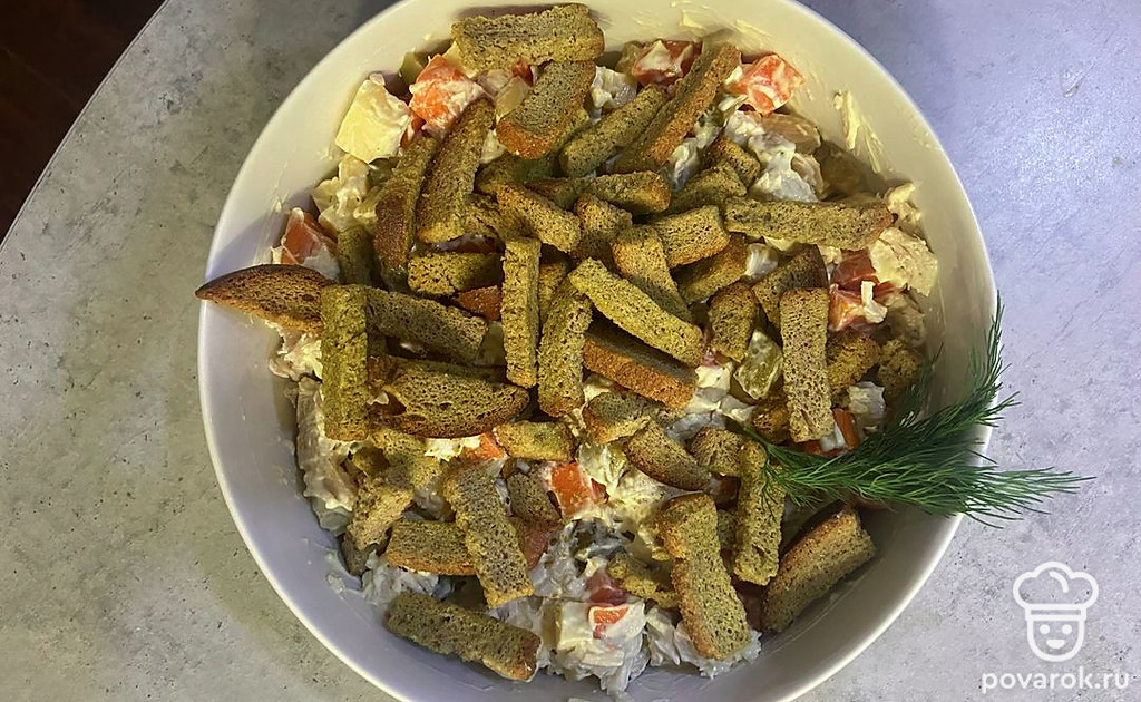 Перед подачей на стол посыпьте салат сухариками. Украсьте веточкой зелени.
