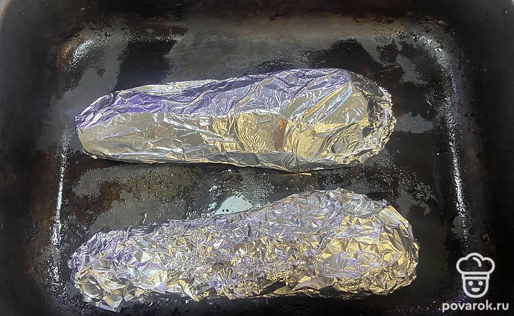 Разрежьте морковь вдоль на две части, заверните в фольгу и отправьте в духовку на 40 минут при 180 градусах.