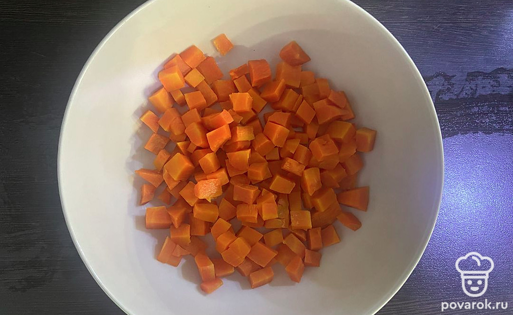 Готовую морковь нарежьте кубиком и выложите в салатник.