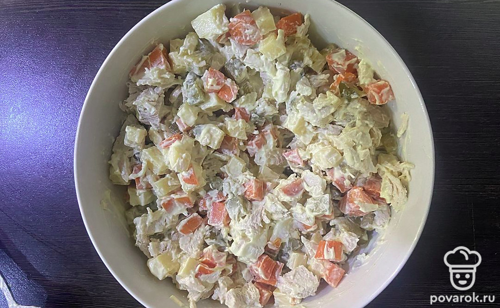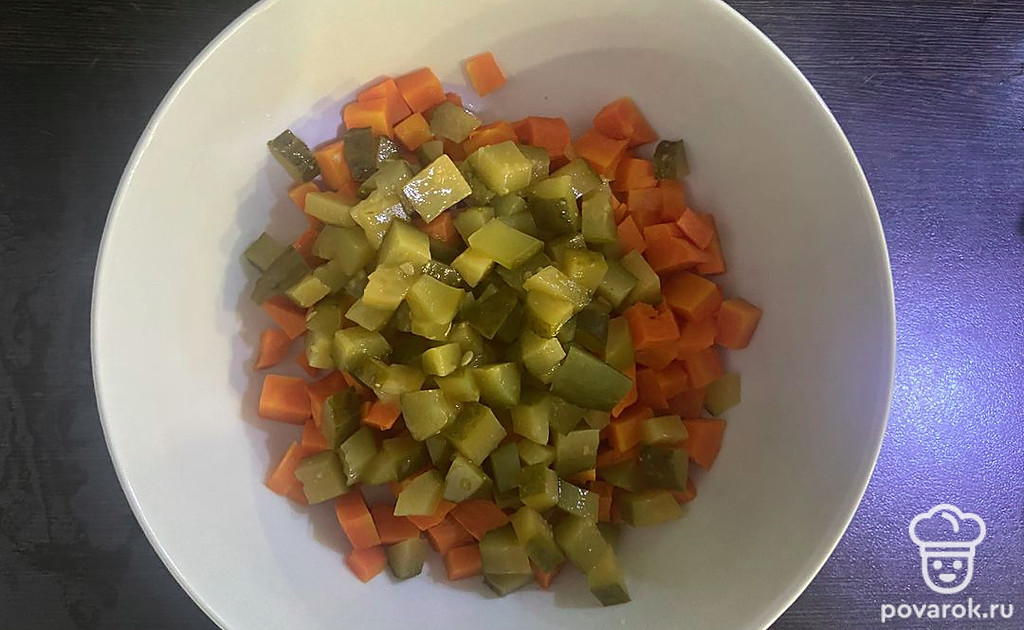 Соленые огурцы нарежьте кубиком и добавьте в салатник.