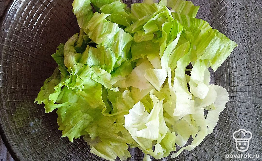 В салатницу выложите нарезанный салат айсберг.