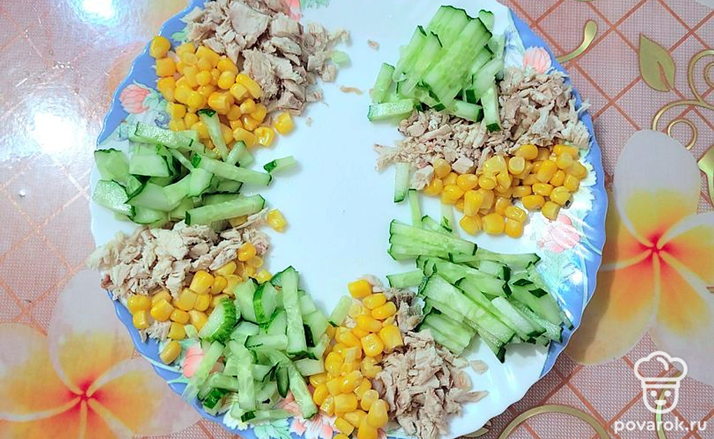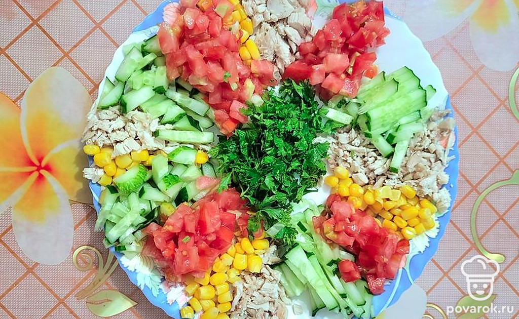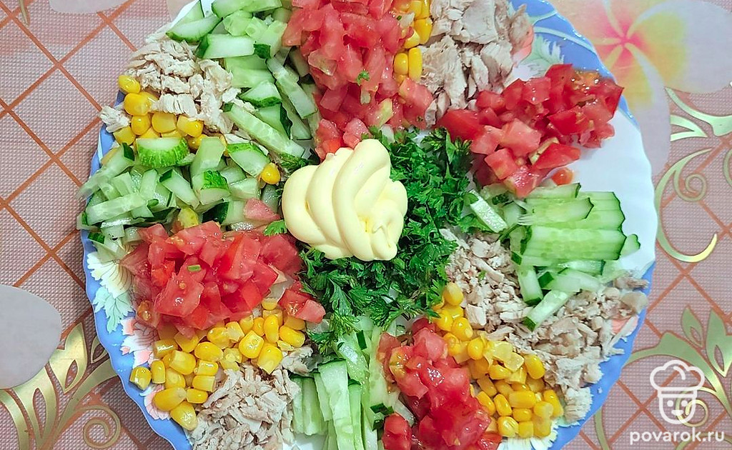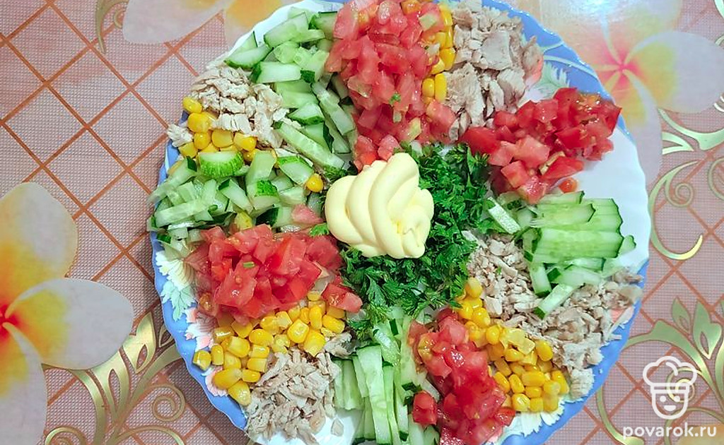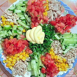 Очень яркий, красивый, сочный и вкусный салат. В нем все ингредиенты отлично сочетаются между собой. Такой салат прекрасно подойдет для праздничного стола.