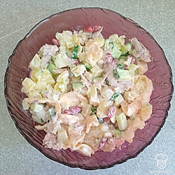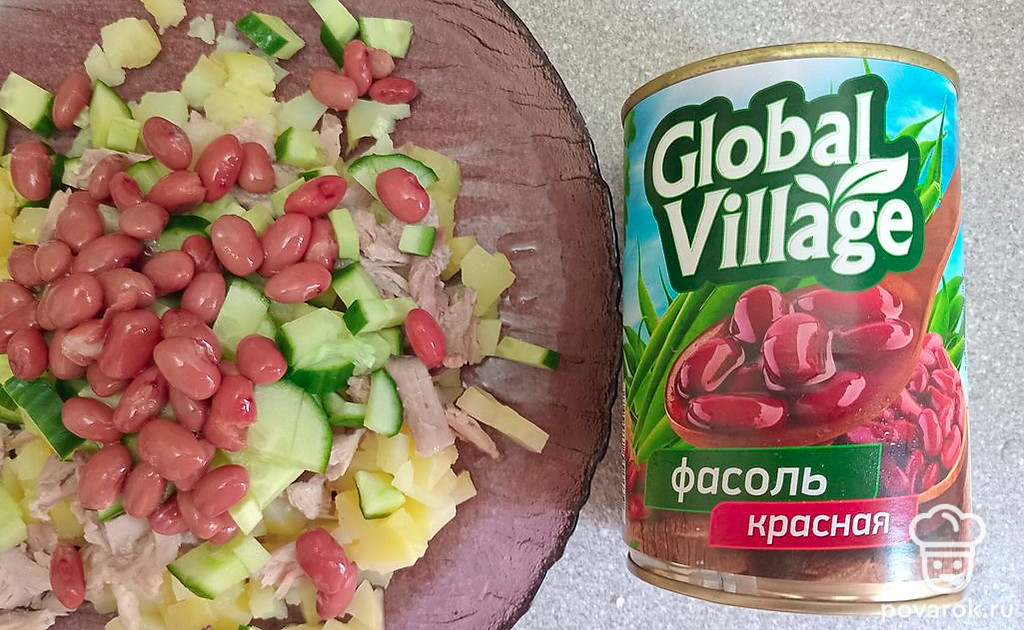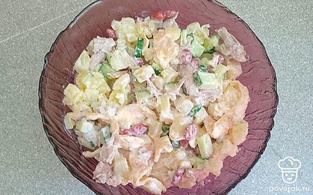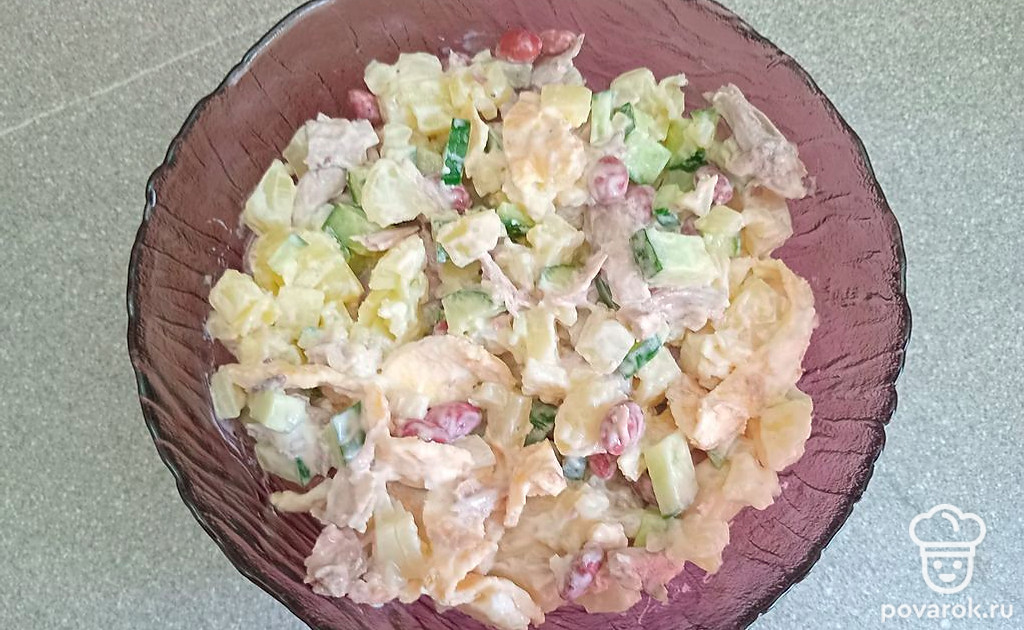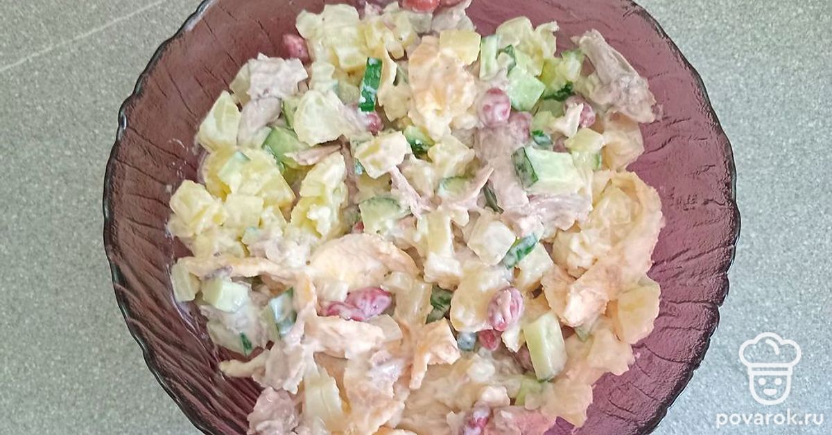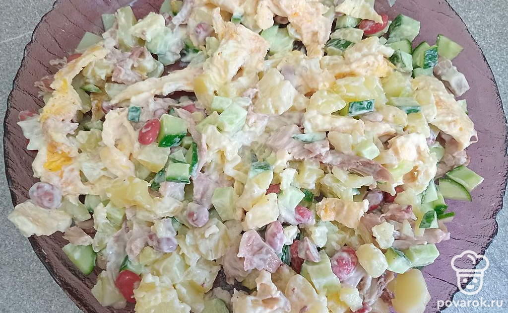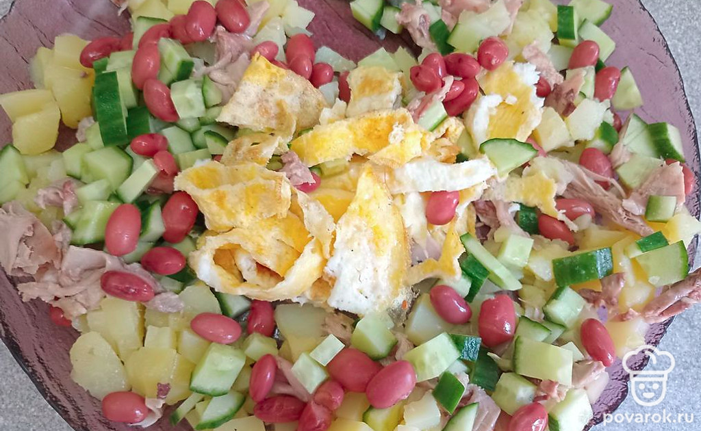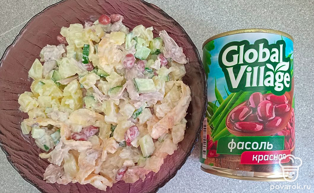 Салат с курицей, консервированной красной фасолью и яичным блинчиком
