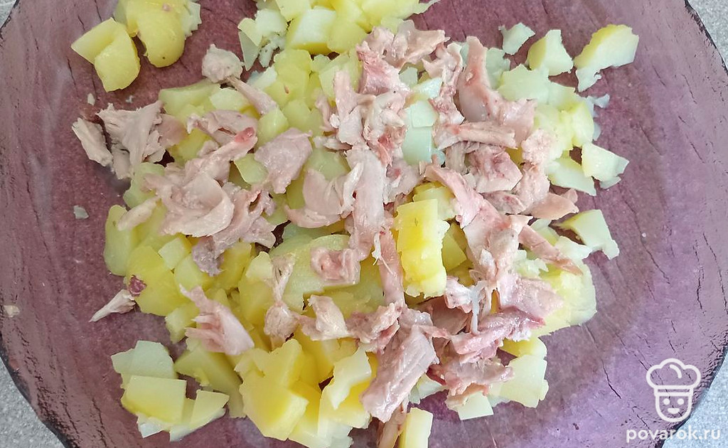 Добавьте нарезанное и заранее отваренное куриное филе.