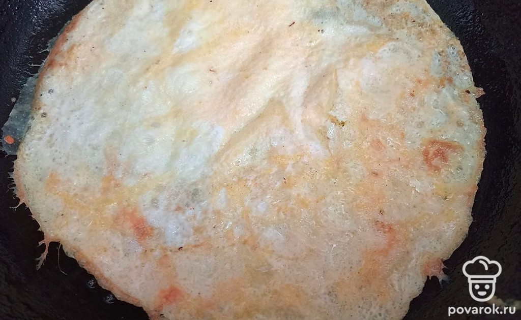 Яйцо взбейте вилкой и вылейте на сковороду, смазанную растительным маслом. Обжарьте яичный блинчик с двух сторон по 30 секунд.