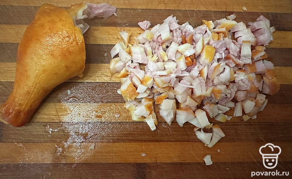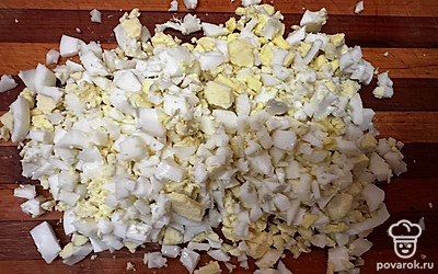 Сварите яйца вкрутую. Остудите, почистите, нарежьте мелким кубиком.