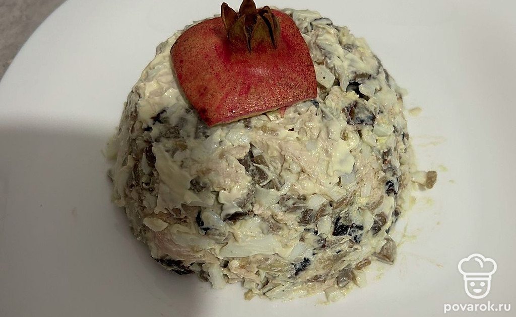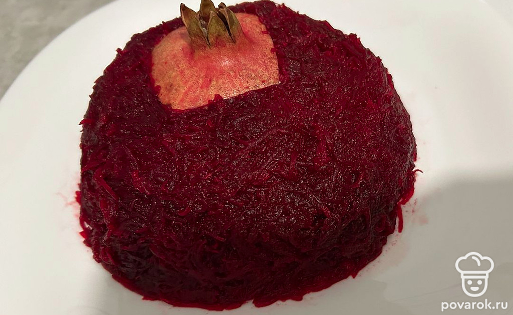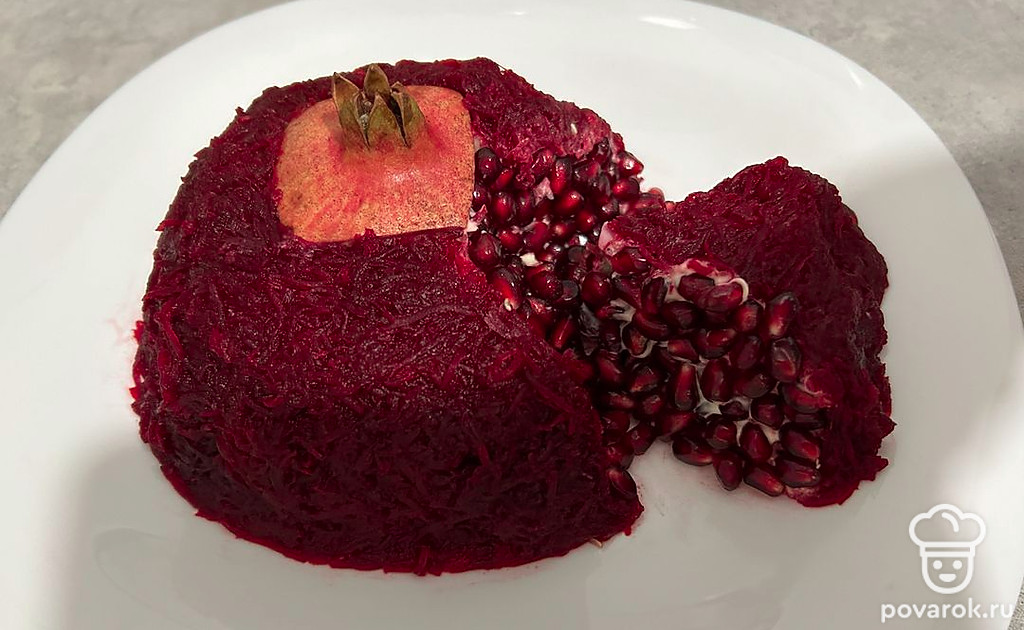 Переложите в миску, утрамбуйте, переверните на основное блюдо. У граната отрежьте хвостик, положите сверху.