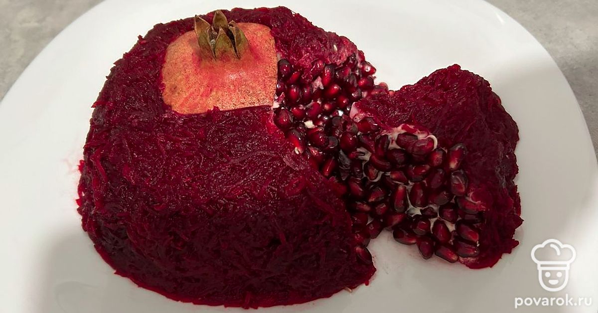 Ложкой отделите небольшую часть салата, делая разрез. Внутри промажьте майонезом и украсьте зернами граната. Приятного аппетита!