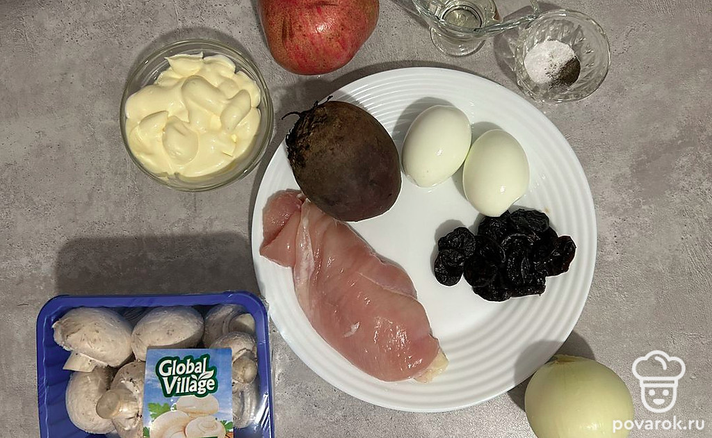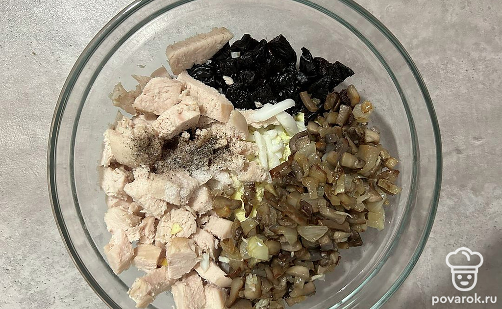 Чернослив замочите на 5 минут в теплой воде, затем мелко нарежьте. Смешайте все ингредиенты, добавьте соль, черный молотый перец и майонез.