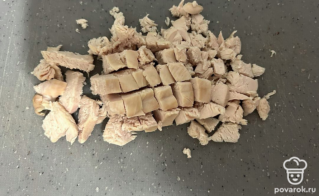 Куриное филе отварите в подсоленной воде и нарежьте средними кубиками.