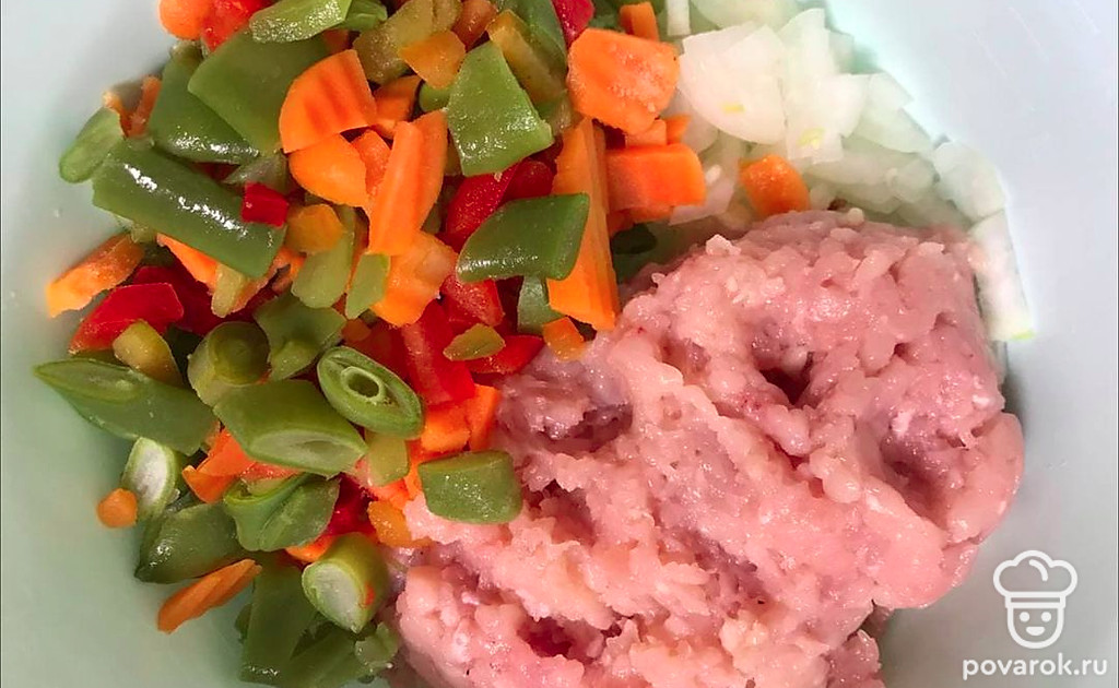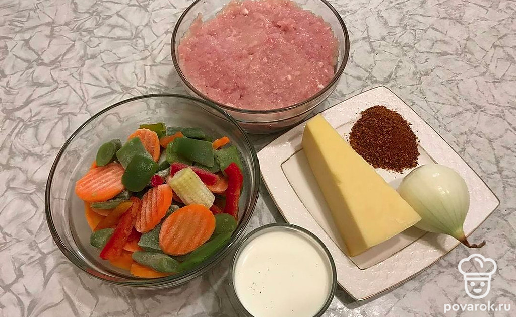 Нарежьте лук мелким кубиком и смешайте его с куриным фаршем и разморозившимися овощами. Сыр натрите на крупную терку и половину добавьте в получившийся фарш.
