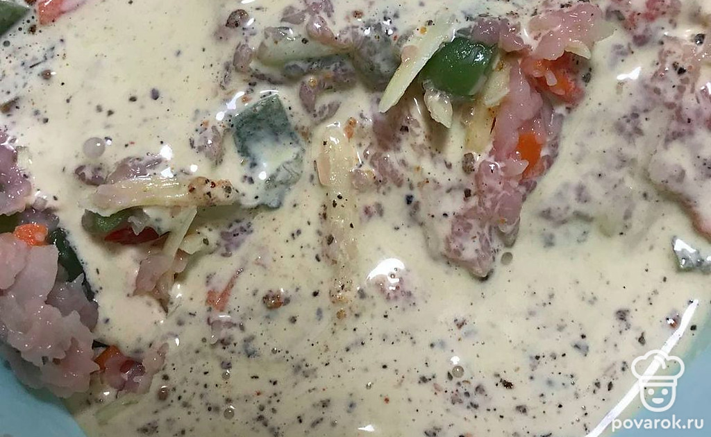 В отдельной миске взбейте яйца со сливками, добавьте соль, перец и специи для курицы. Добавьте получившуюся смесь в фарш с овощами и тщательно все перемешайте.