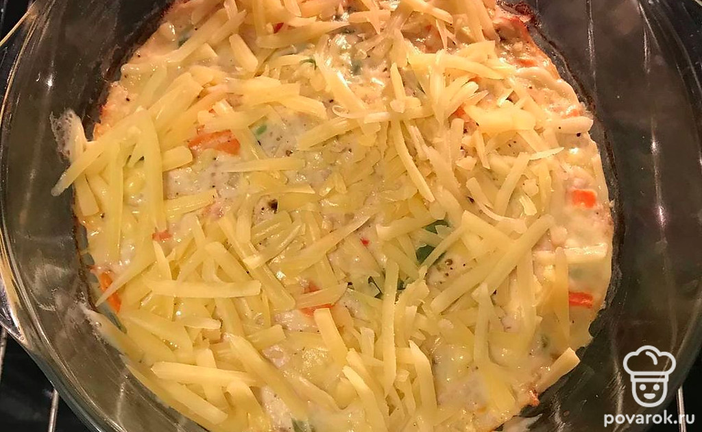 Выложите получившуюся массу в форму для запекания и поставьте в разогретую до 200℃ духовку на 25 минут. Затем посыпьте террин оставшимся сыром и поставьте в духовку еще на 5 минут, чтобы сыр расплавился.