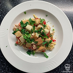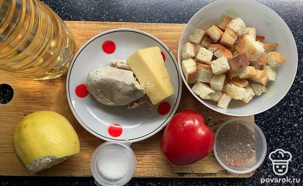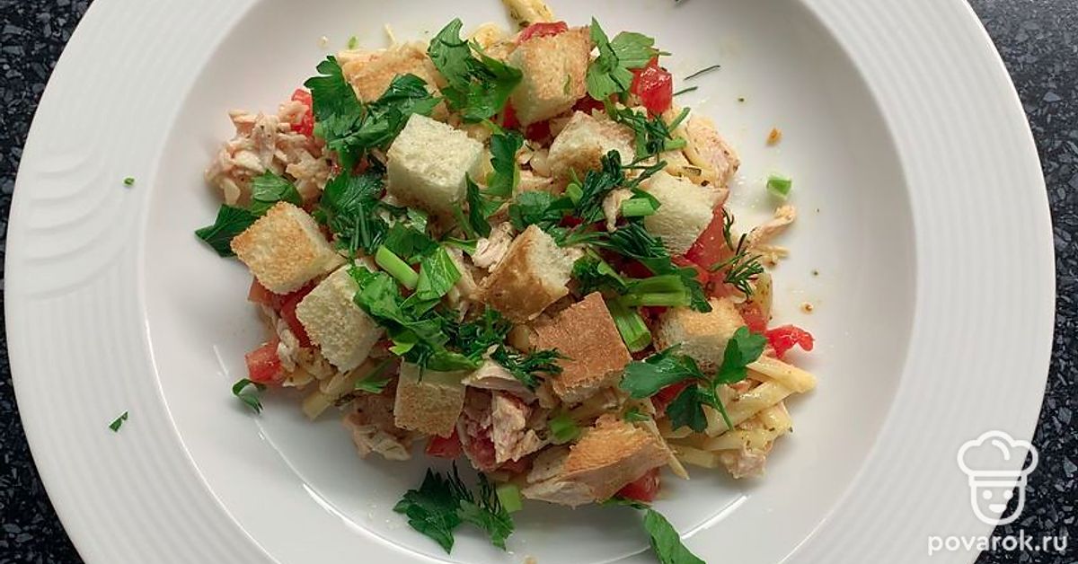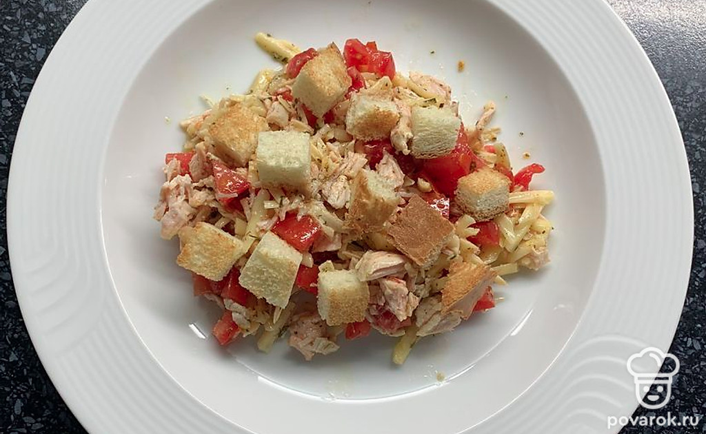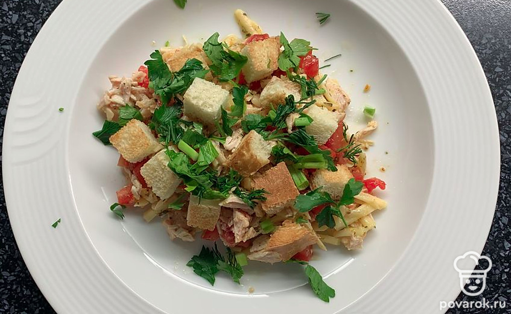 Салат с куриной грудкой, помидорами, сыром и сухариками