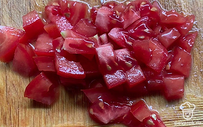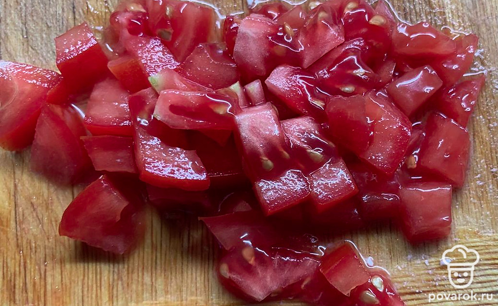Помидоры нашинковать кусочками.
