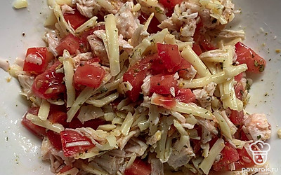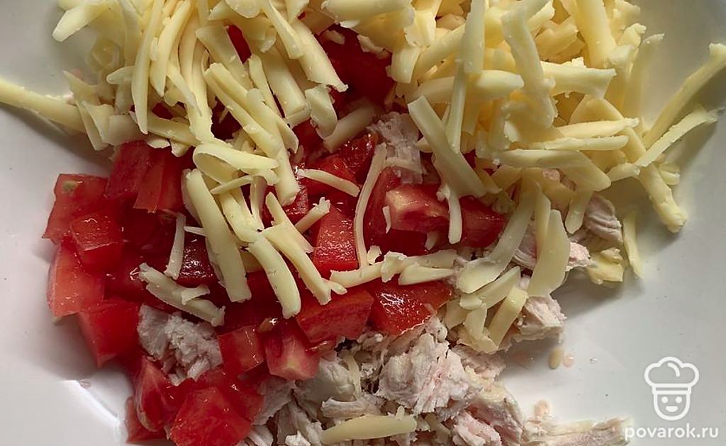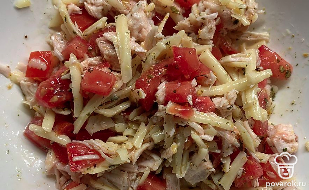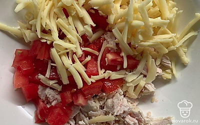 Соединить сыр, куриную грудку и помидоры. Подсолить.