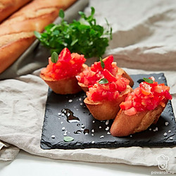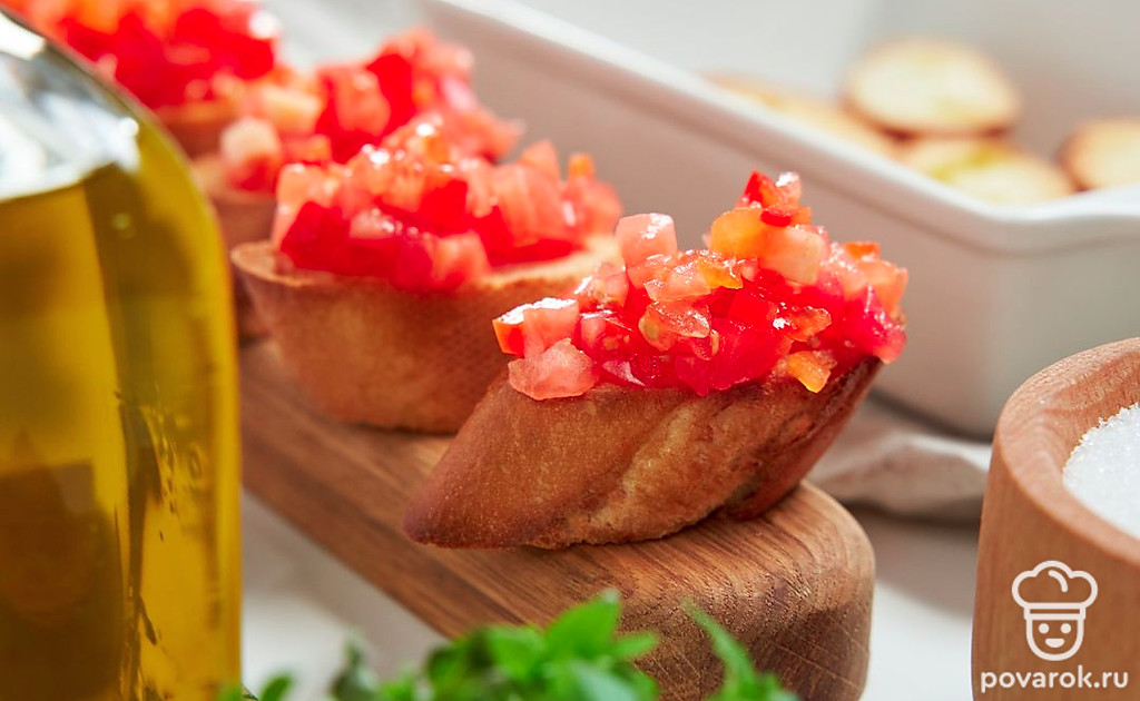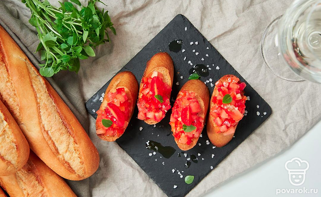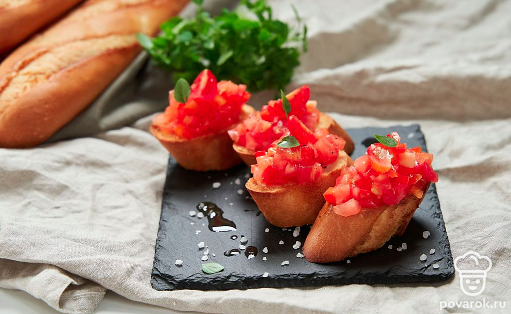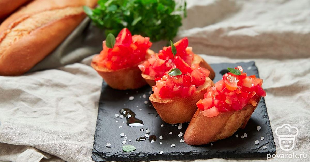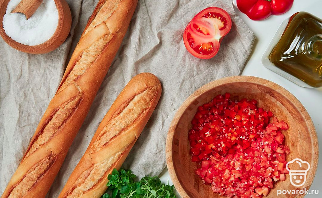 Полезной альтернативой привычным бутербродам может стать брускетта с помидорами и сладким перцем. Это итальянское блюдо, которое традиционно готовится из хрустящего хлеба, специально подсушенного на сковороде или решетке, и различных начинок из ветчины, оливок, сыра. Приготовьте брускетту из багета: он мягкий внутри и хрустящий снаружи.