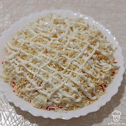 Вторым слоем будет сыр, натертый на терке. Сверху смажем майонезом.