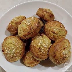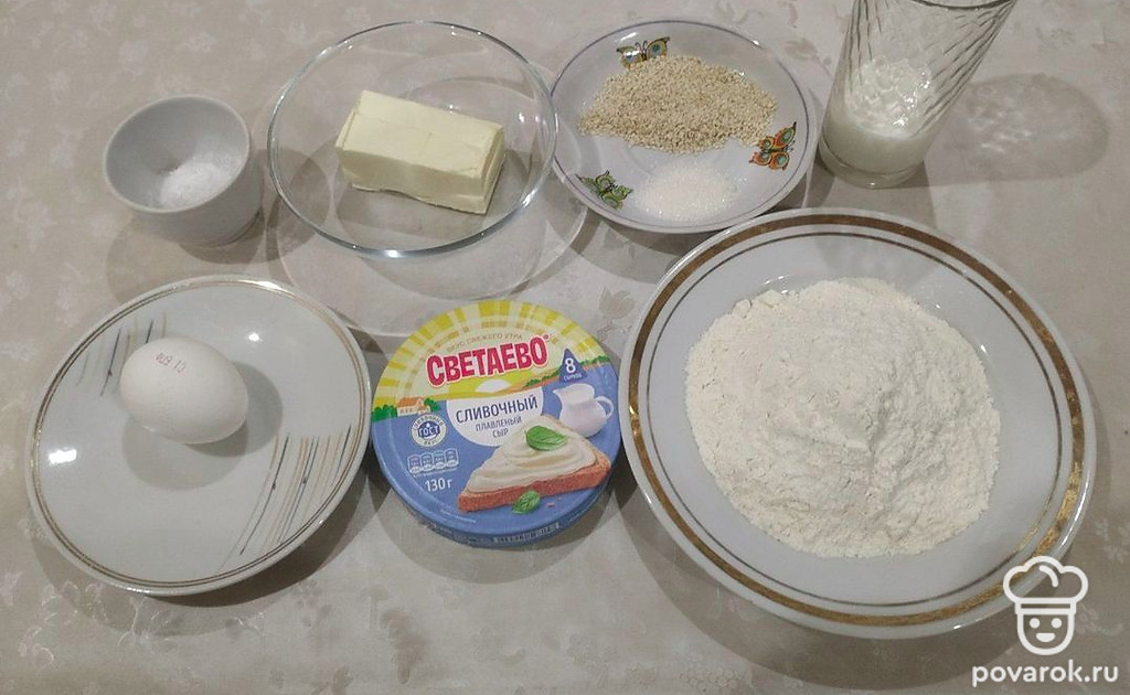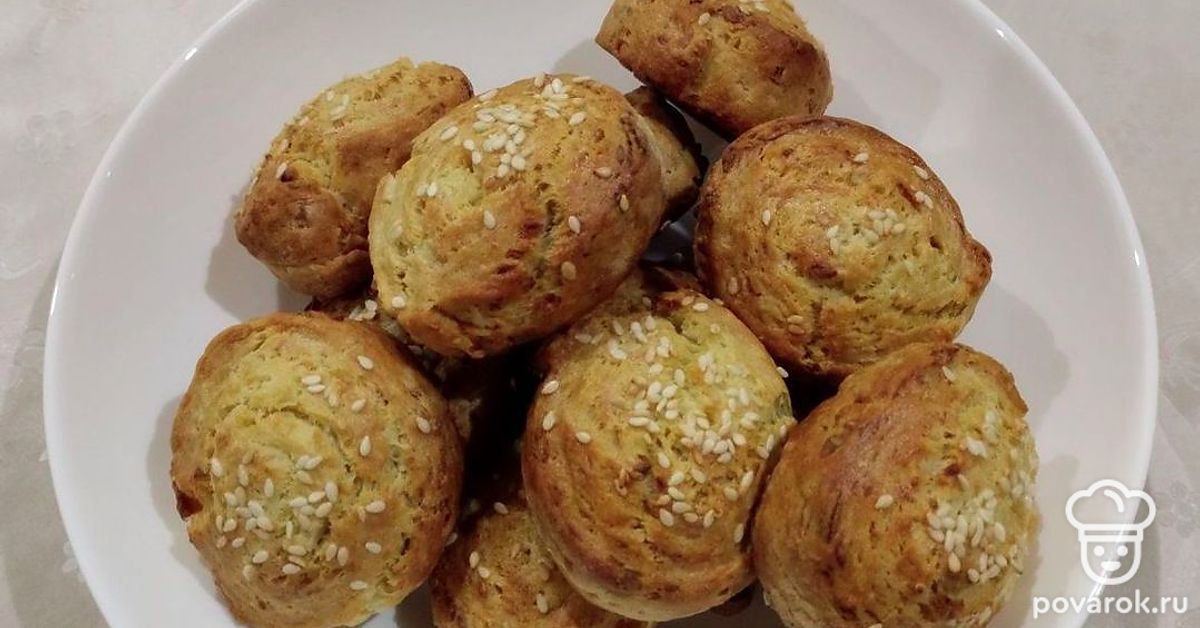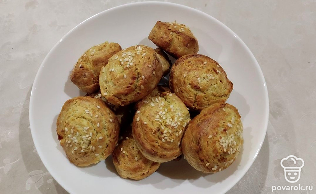 Нарежьте тесто на кружочки, выложите на пергамент, смажьте молоком и посыпьте кунжутом. Отправьте в разогретую духовку на 20 минут при 180 градусах.