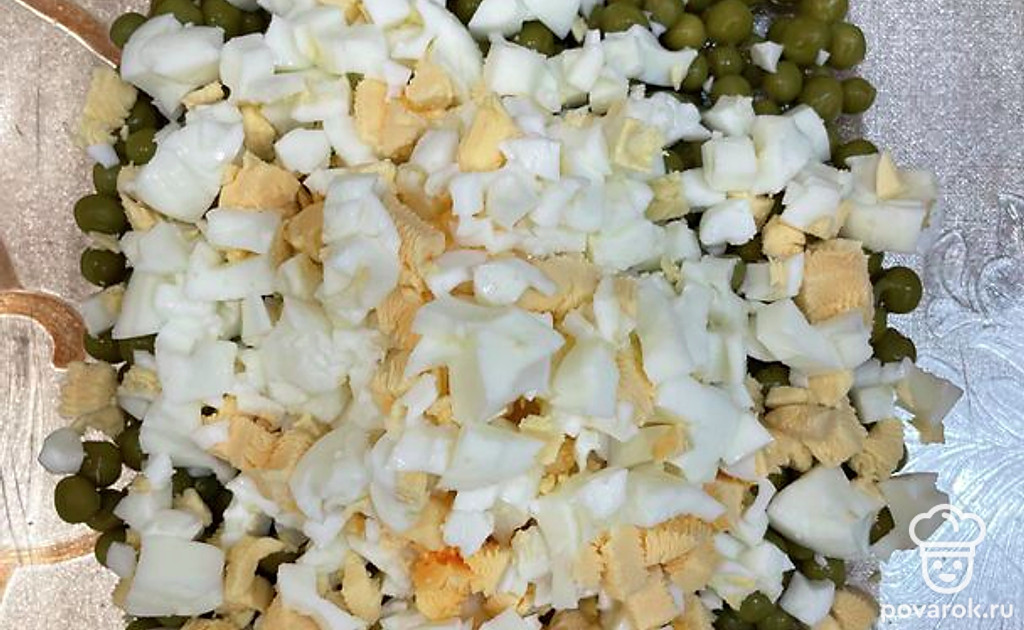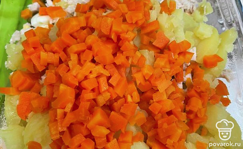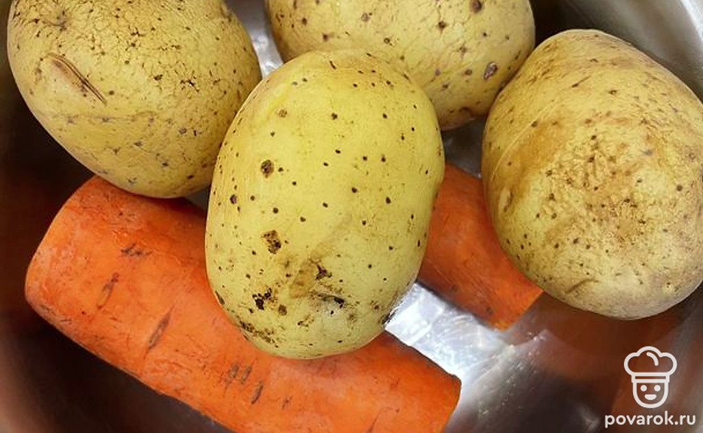 Яйца варим 10 минут в воде. Картофель и морковь ставим в микроволновку на 10 минут.