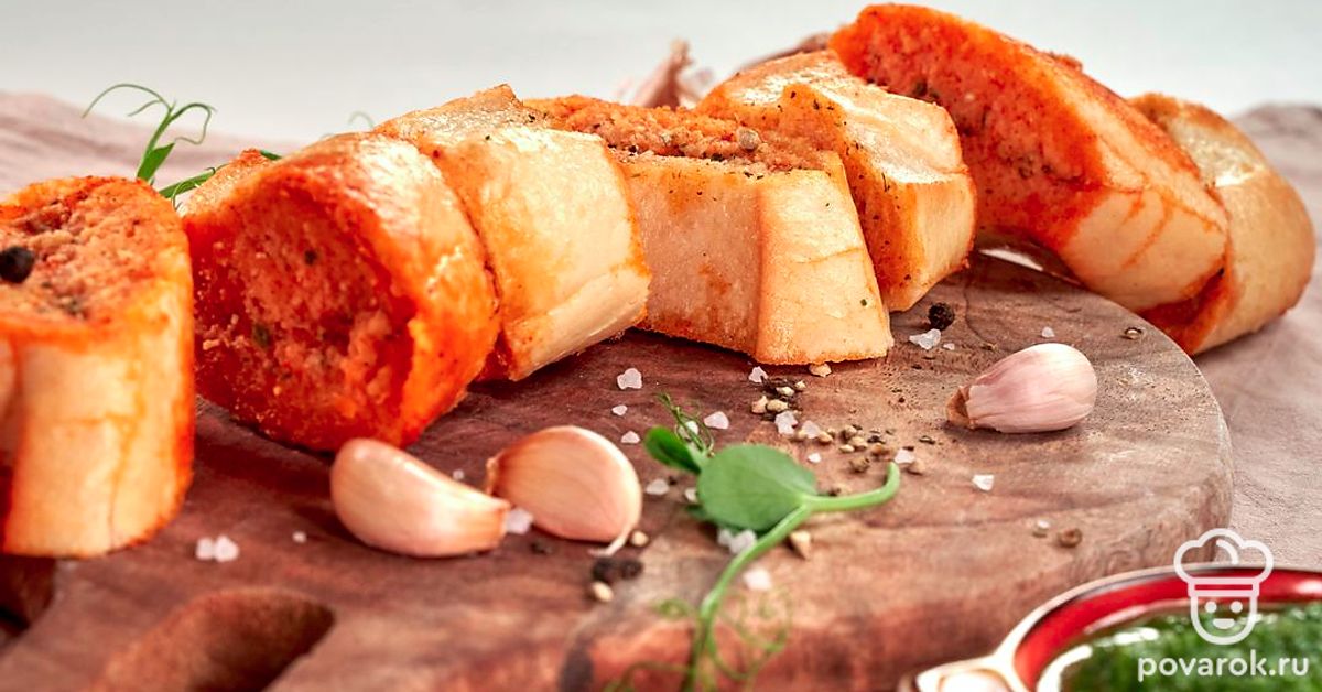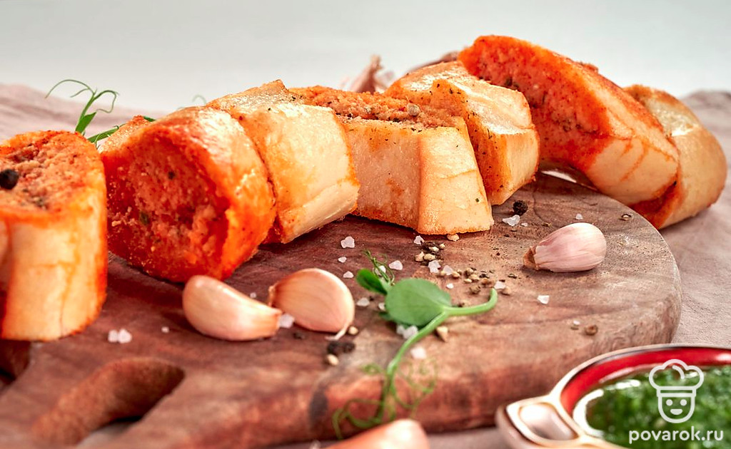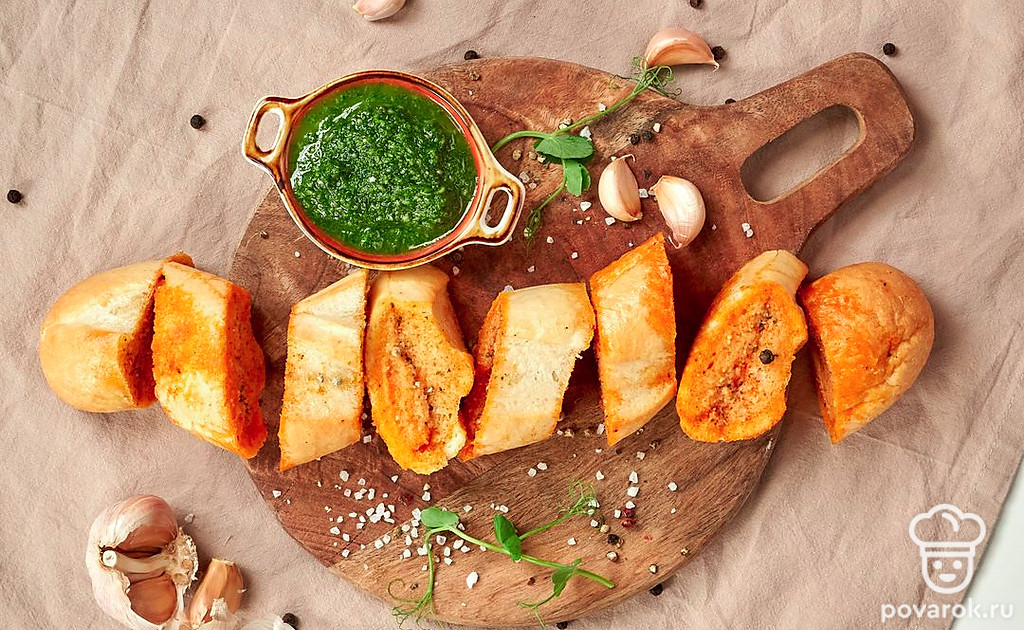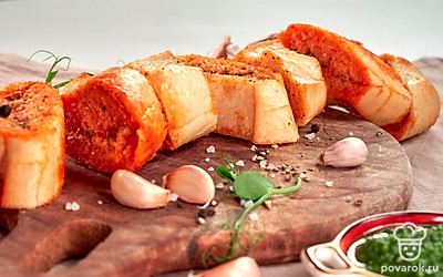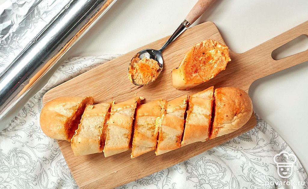 Настоящий багет с зажаренной корочкой и кружевным мякишем можно дополнить ароматным чесночным маслом и дополнительно запечь в фольге. Чесночное масло богато витаминами и микроэлементами, обладает насыщенным вкусом и запахом. Фольга сохранит багет от пересыхания, и благодаря ей он хорошо и равномерно пропечется. Получится и пикантная закуска, и замена обычному хлебу. С ингредиентами в начинке можно экспериментировать, добавлять по вкусу разные виды сыра и зелени, приправ и специй.