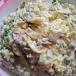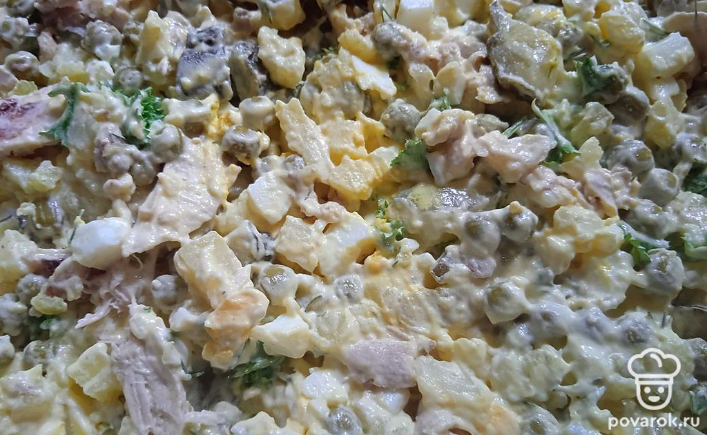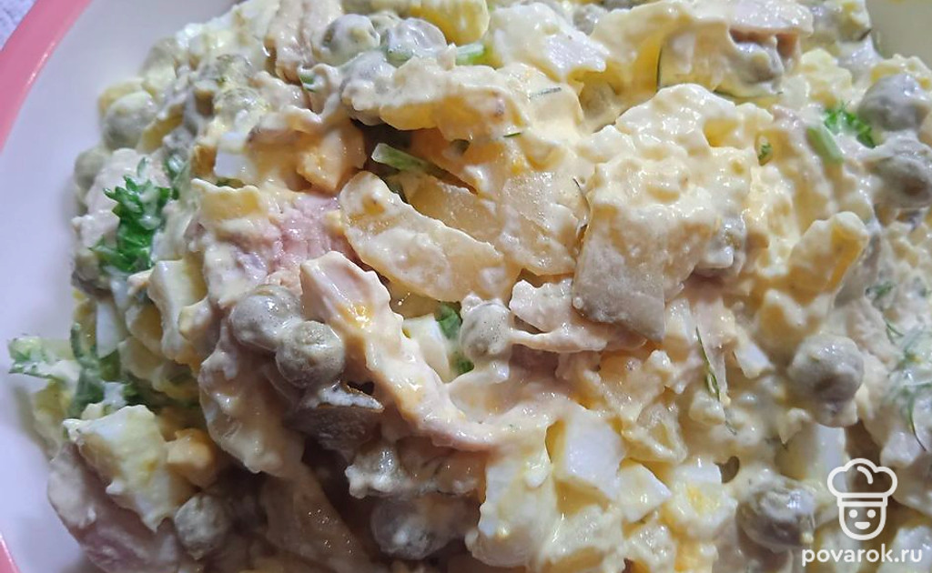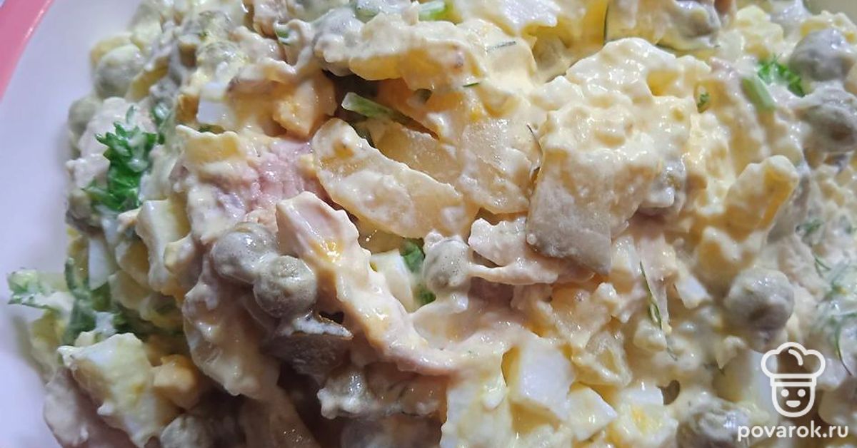 Вкусный сытный салат. Хорошо будет смотреться как на праздничном, так и на повседневном столе.