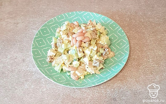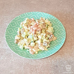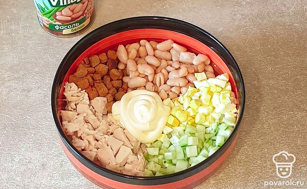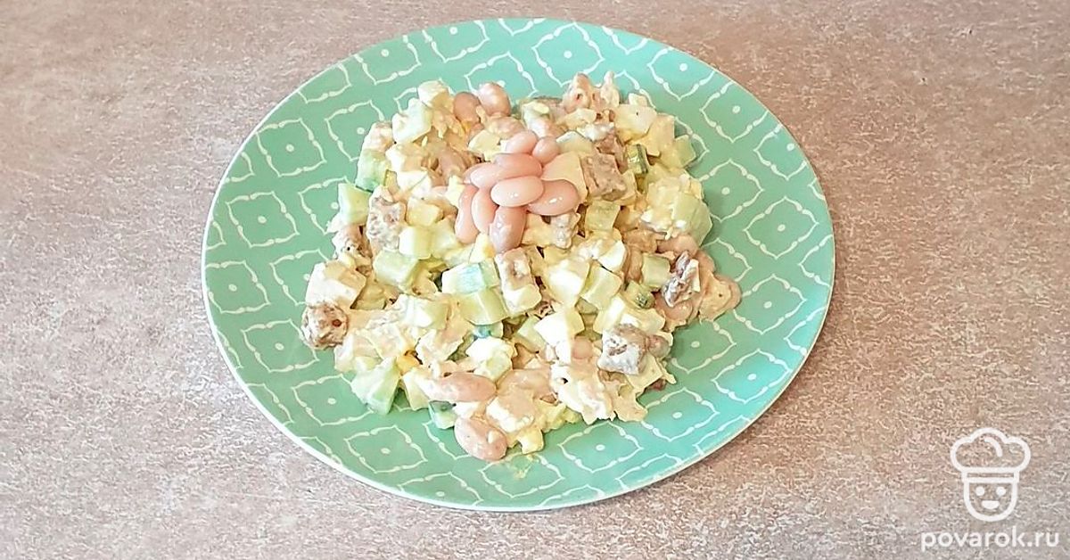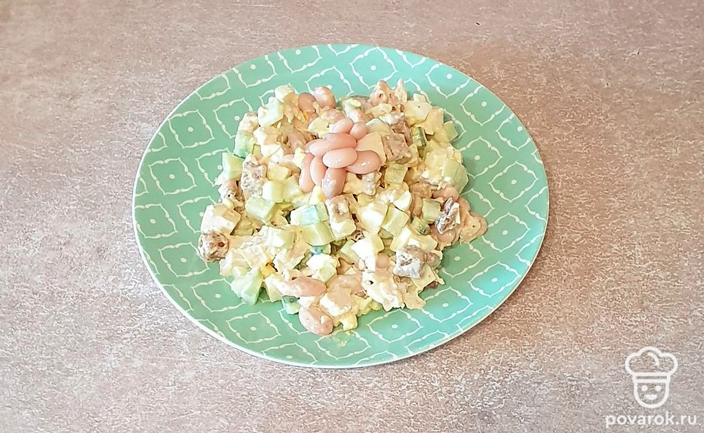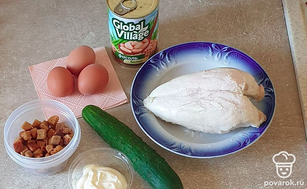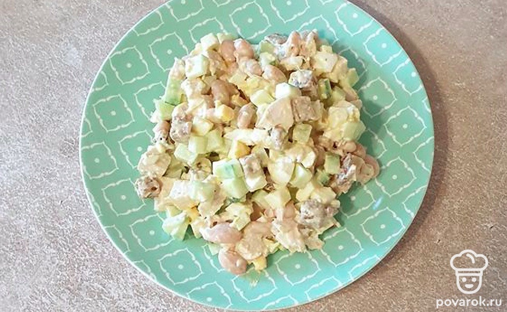 Нежная куриная грудка с фасолью, хрустящими сухариками и сочным огурцом. Простой в приготовлении салат, подойдет для семейного ужина или прихода гостей.