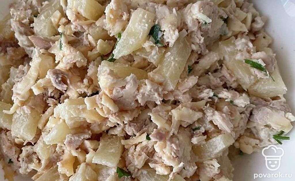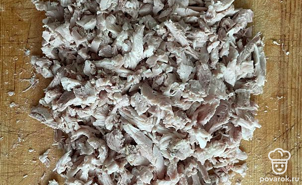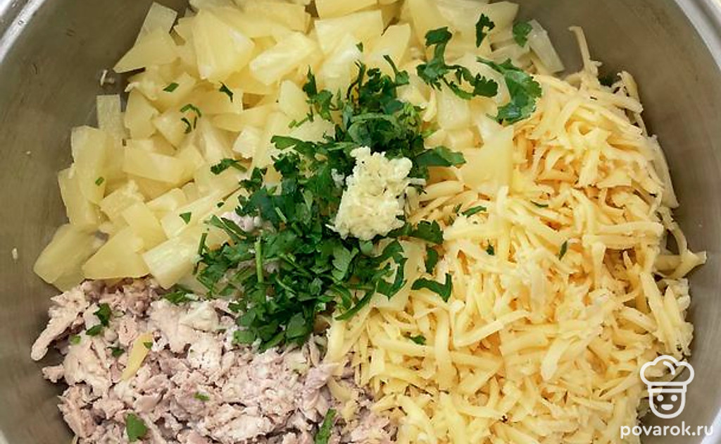 Соединить все ингредиенты и добавить измельчённые чеснок и петрушку.
