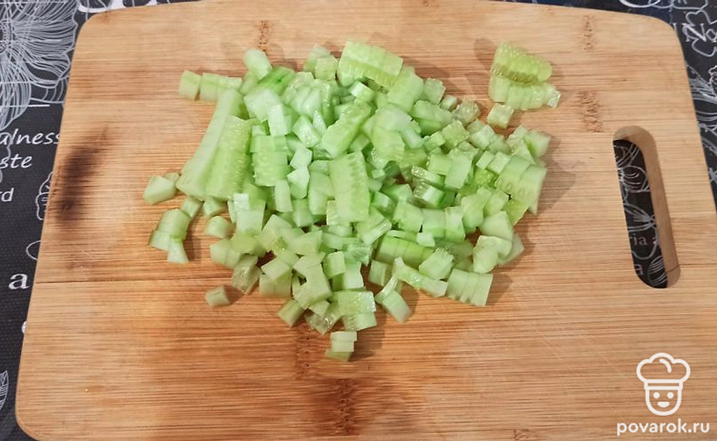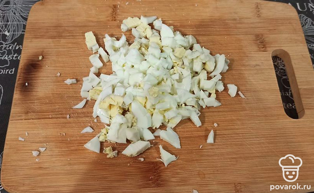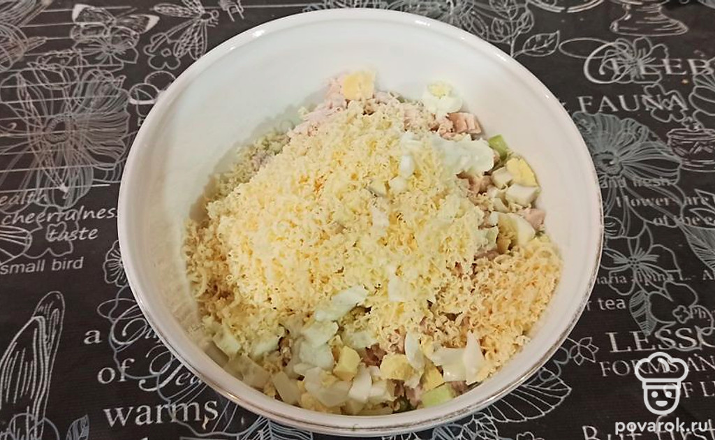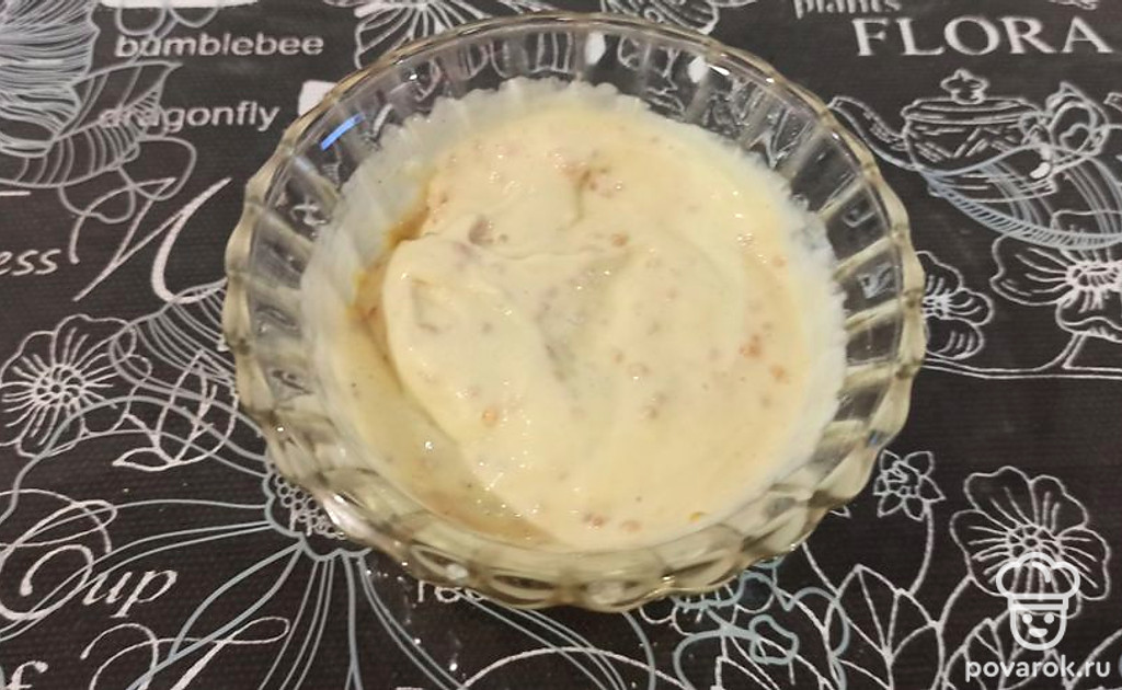 Делаем соус: майонез соединяем с дижонской горчицей и натертым чесноком. Заправляем салат соусом.