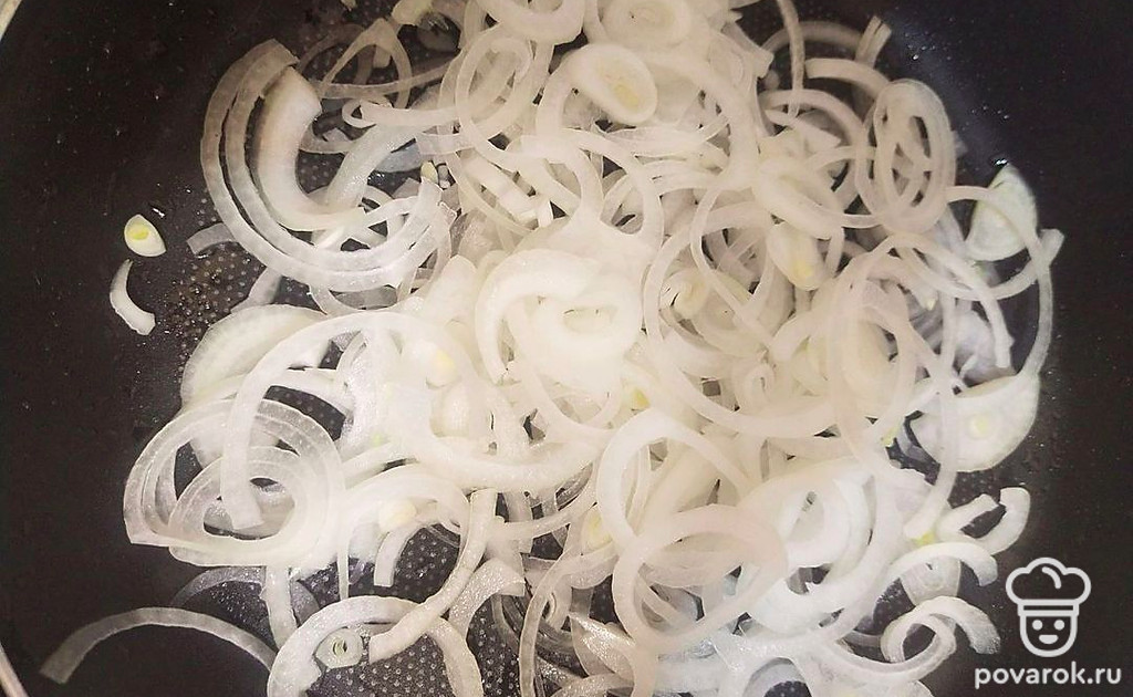 Лук нарезать полукольцами и отправить на разогретую сковороду с растительным маслом обжариваться до мягкости.