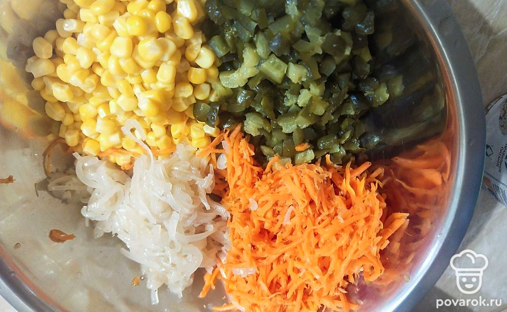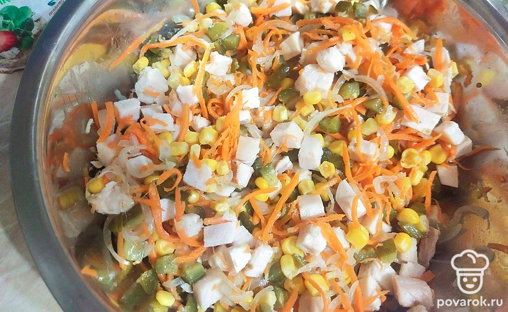 В миску добавить нарезанную курицу, огурцы, обжаренный лук, кукурузу, корейскую морковь. Морковь предварительно отжать от лишней жидкости.