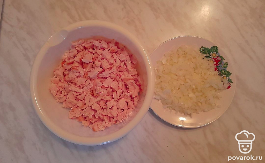Удалите кости с куриной грудки, нарежьте ее средним кубиком. Очистите лук от шелухи и мелко накрошите овощ.